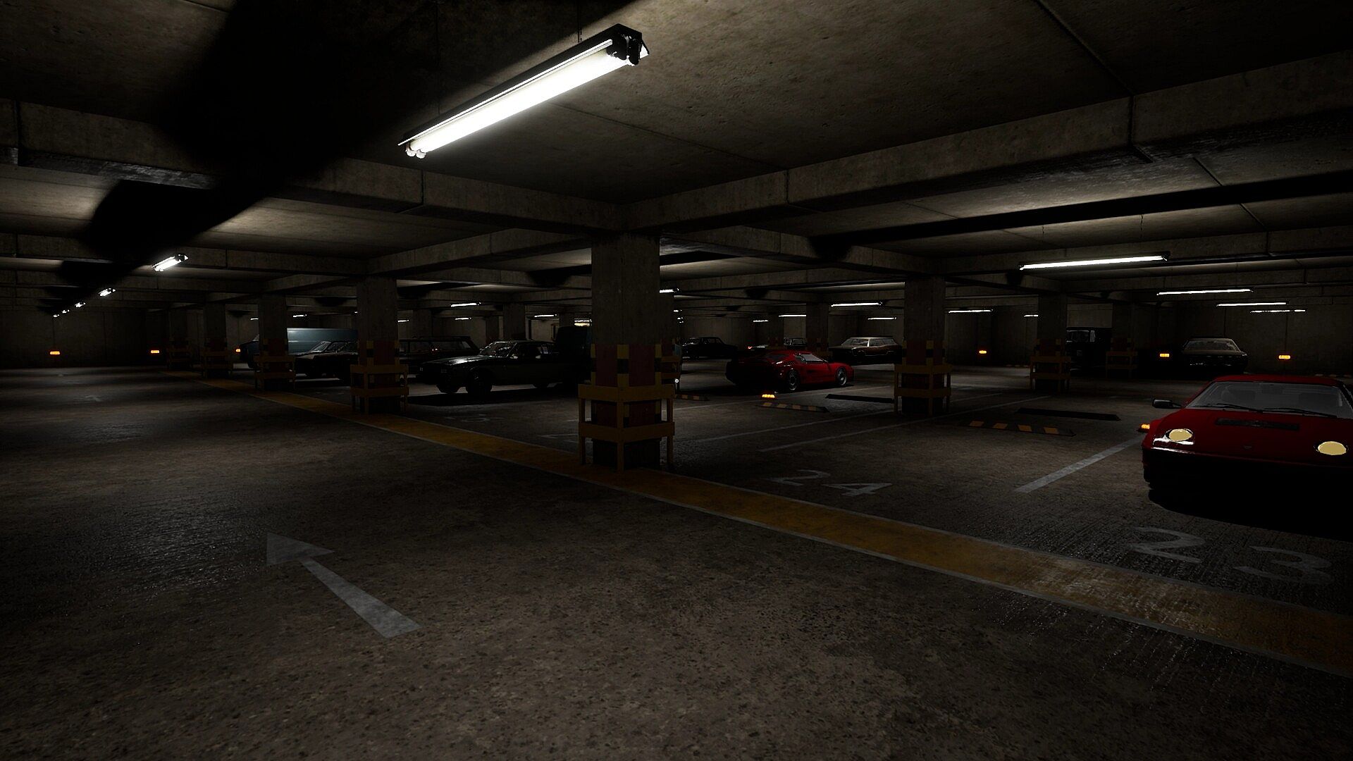 This is a horror game set in an underground parking lot with an FPS perspective.