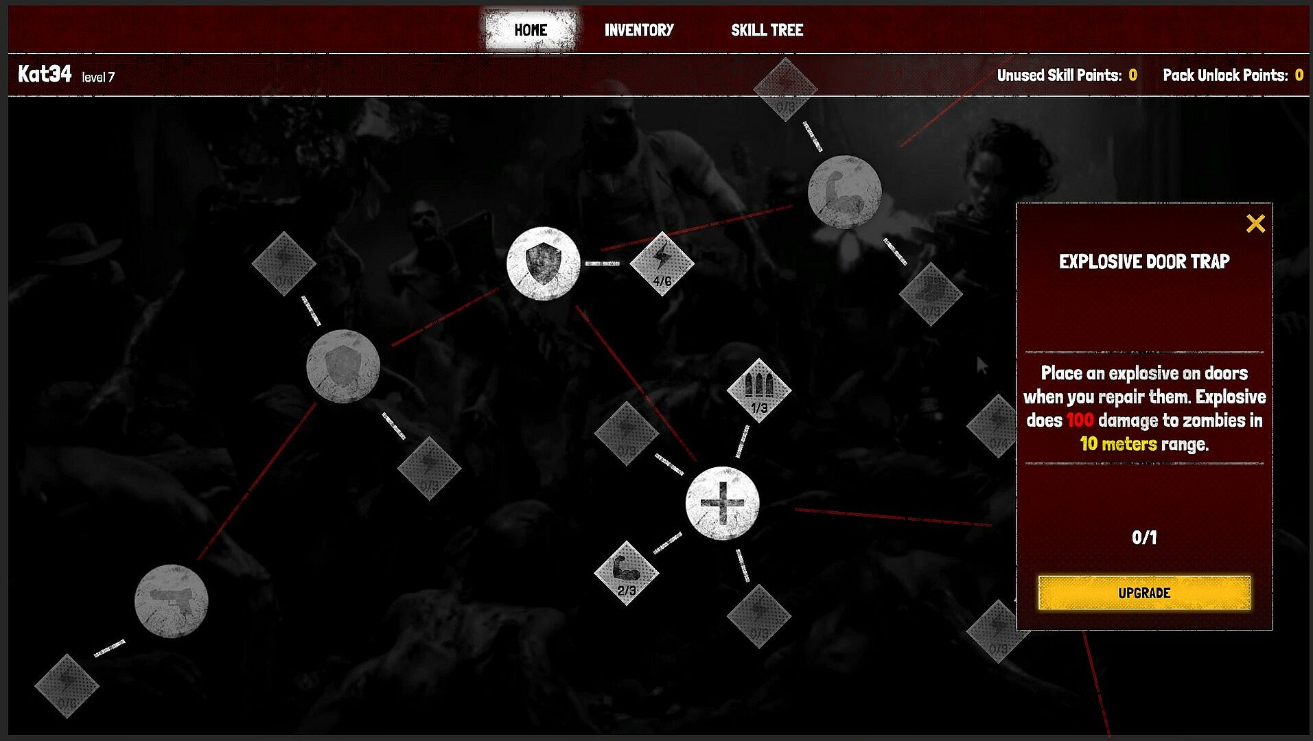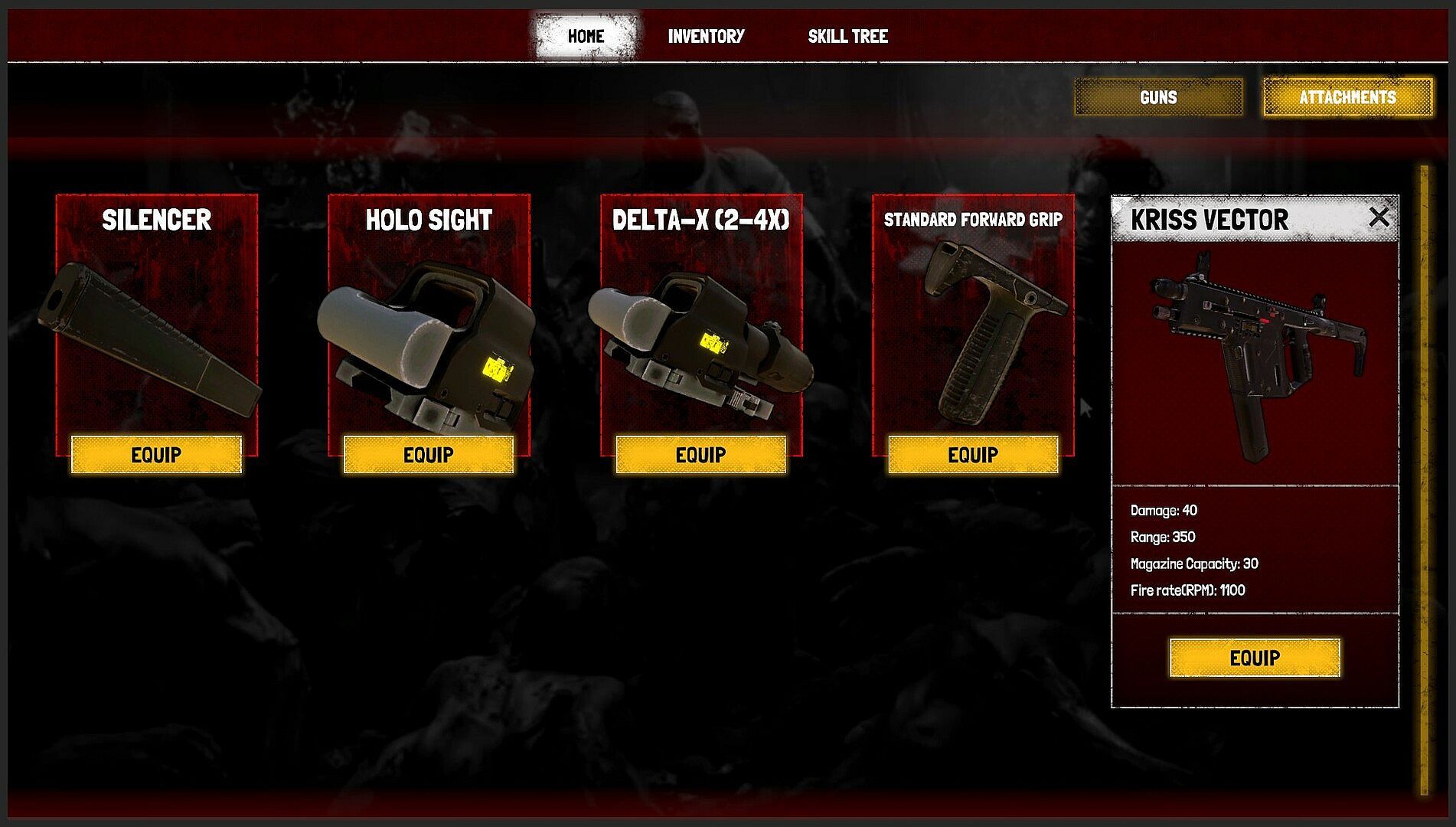Every time you die, you earn experience based on your performance in slaying zombies. These experience points will give you skill tree points. You will use those skills to unlock new skills(active skills such as Grenade Launcher), guns and attachments, and buffs(passive skills such as +%10 Maximum HP)