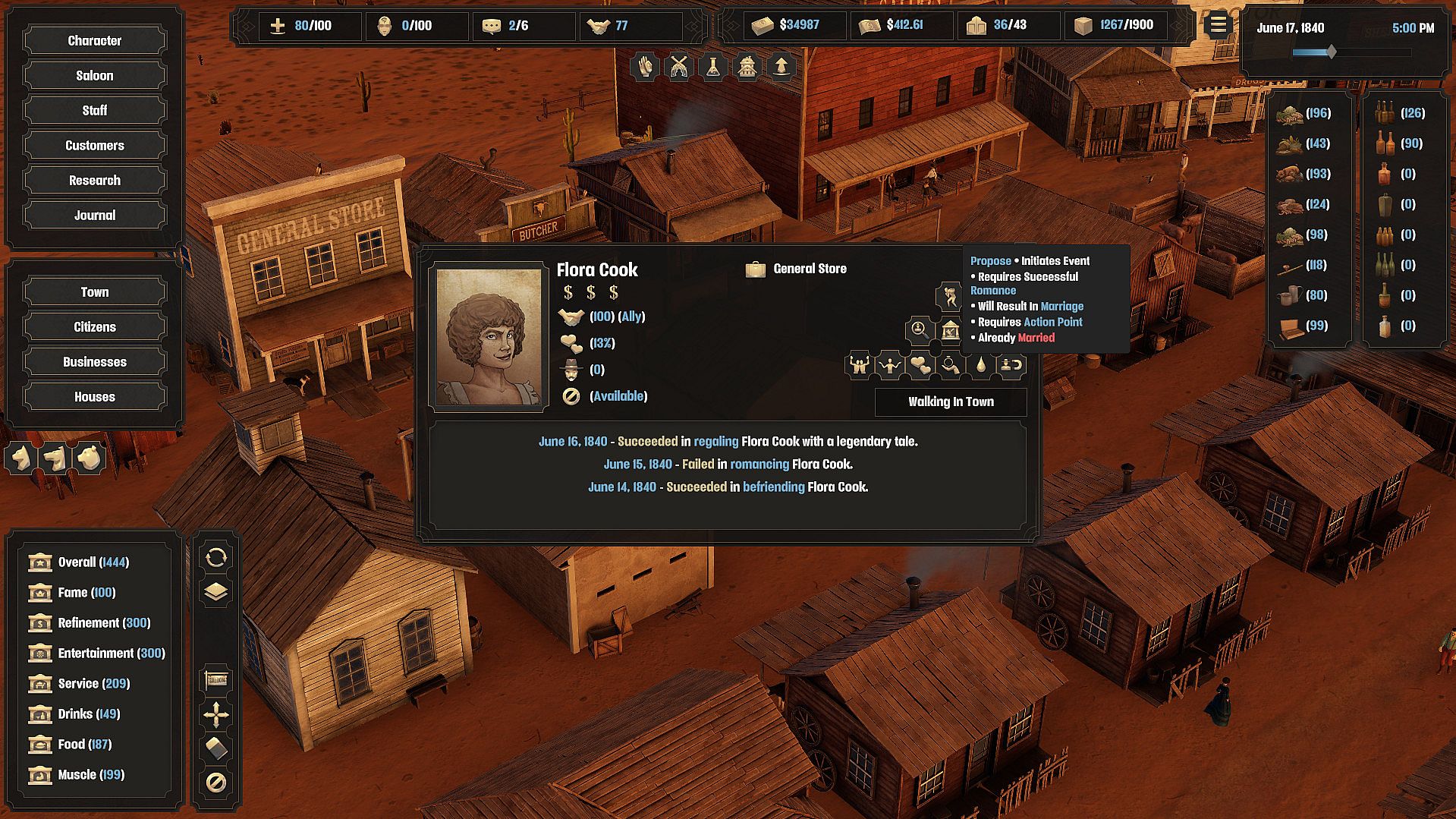 Thrive within a complex economy system, stockpiling booze, food, guns, and opium. Research a diverse array of drinks and foods to serve customers. Hire and manage staff from within the town populace, including barkeeps, cooks, servers, prostitutes, croupiers, pianists and bouncers. Help them reach their full potential, or fire and replace them with those more skilled.