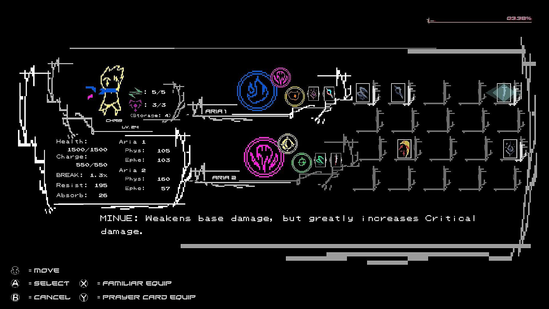 Christian’s world is rendered with a surreal aesthetic like no other. Harsh, pulsating scratches upon a sea of darkness render a thick atmosphere brooding with emotion. Battles come to life in an animated spectacle of light and motion that remains easy to parse in play.