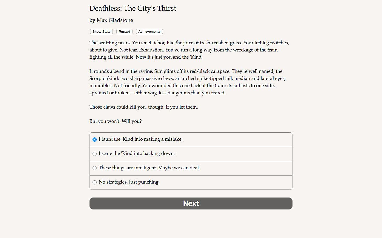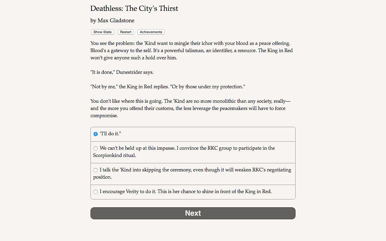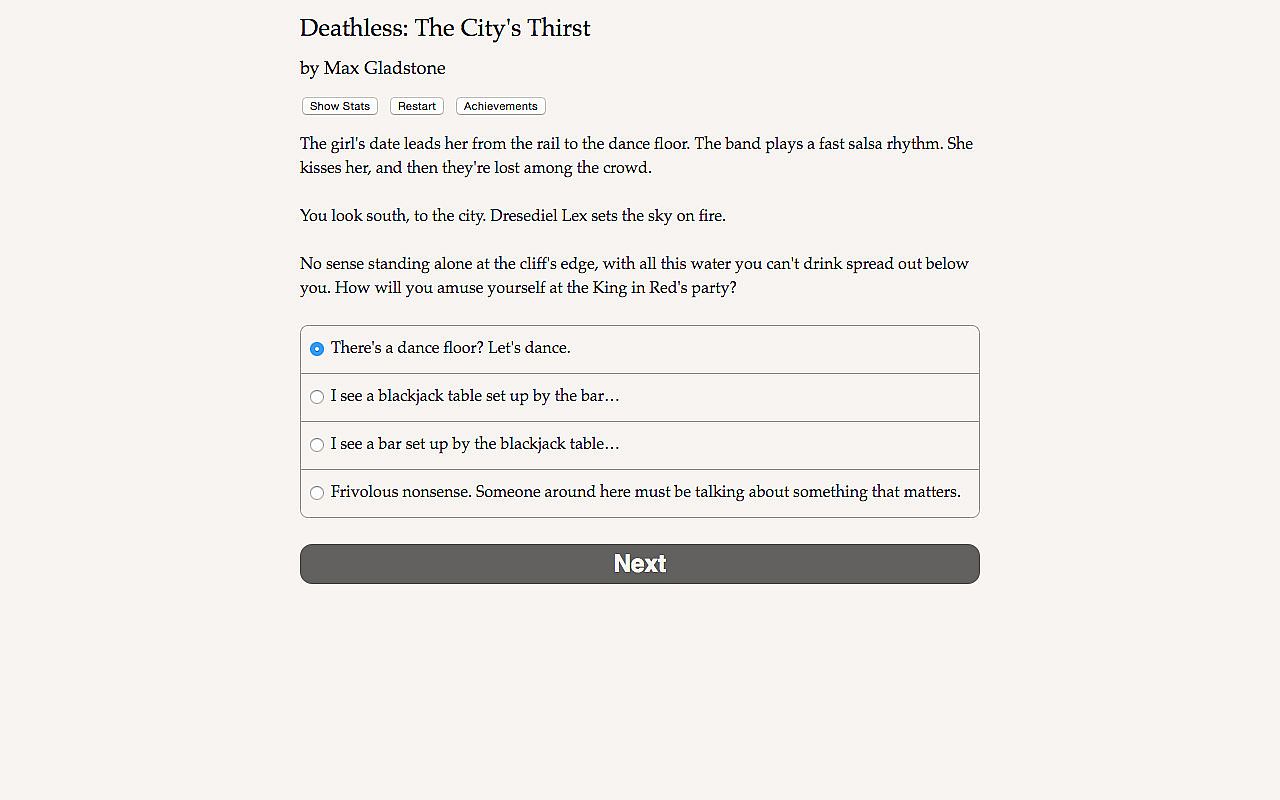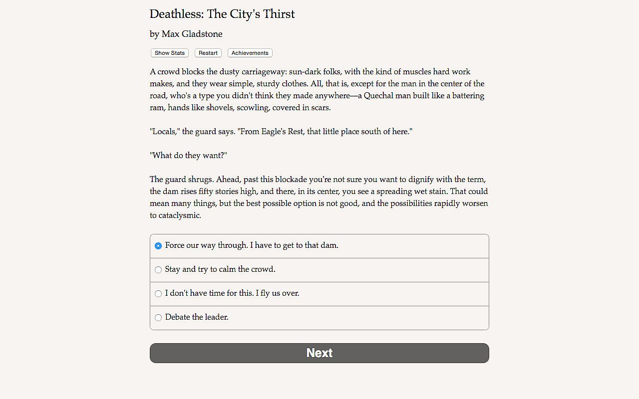 Deathless: The City’s Thirst is a 150,000-word interactive novel by Max Gladstone, author of Choice of the Deathless and the Craft Sequence novels, nominated for the John W Campbell Best New Writer Award, the XYZZY award, and the Lambda Award. Your choices control the story. It's entirely text-based--without graphics or sound effects--and fueled by the vast, unstoppable power of your imagination.