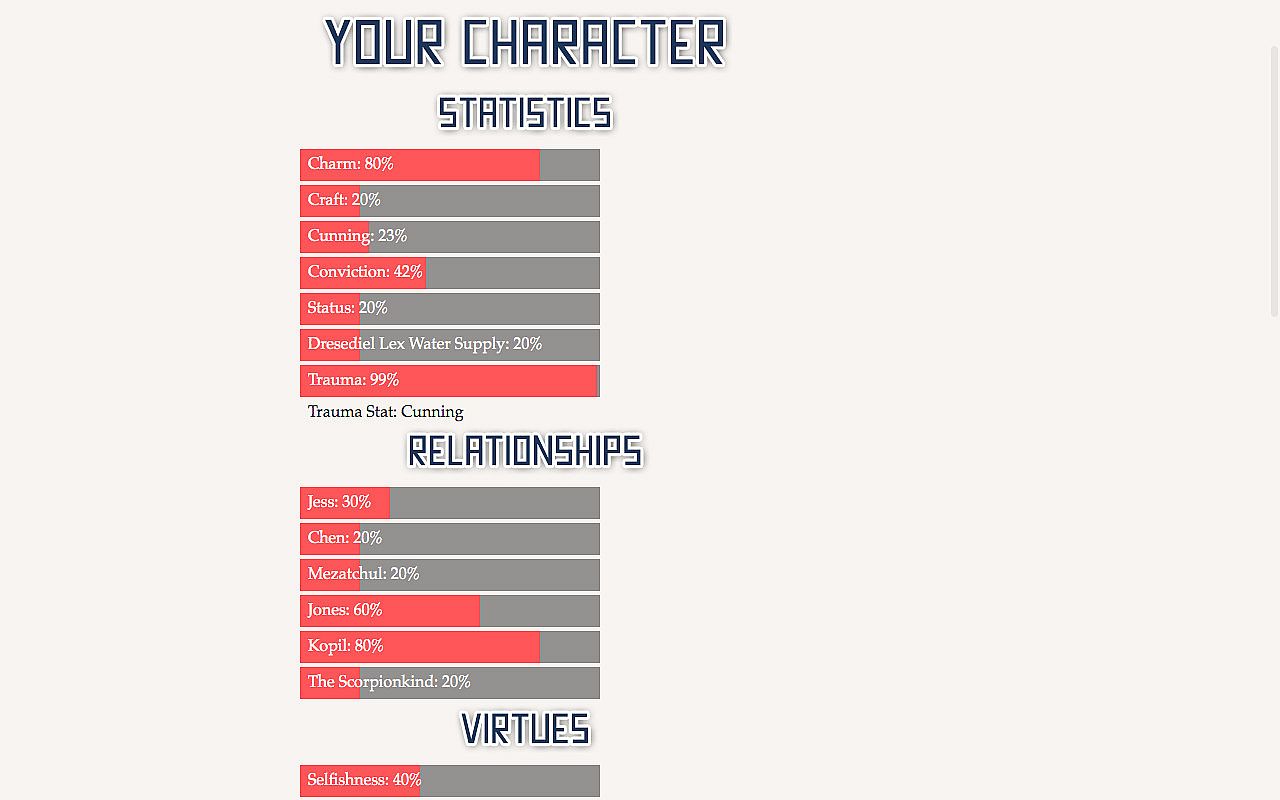 You won the God Wars, killing the rain god and taking over his desert city. But now the city needs water, and it’s your job to make it rain. As a rising associate at a god-killing public service conglomerate, you can monopolize your city’s public utilities, or fight to keep water affordable for everyone. Build alliances with powerful necromancers, or help local farmers hold onto their land. Find love, or betray your friends. Overcome the trauma you suffered in the God Wars. Prevent murders, or commit them.