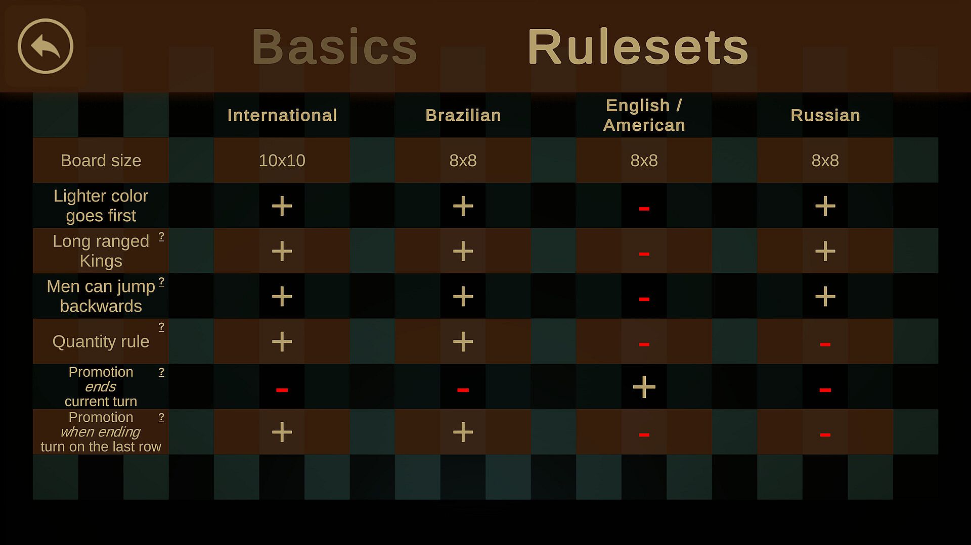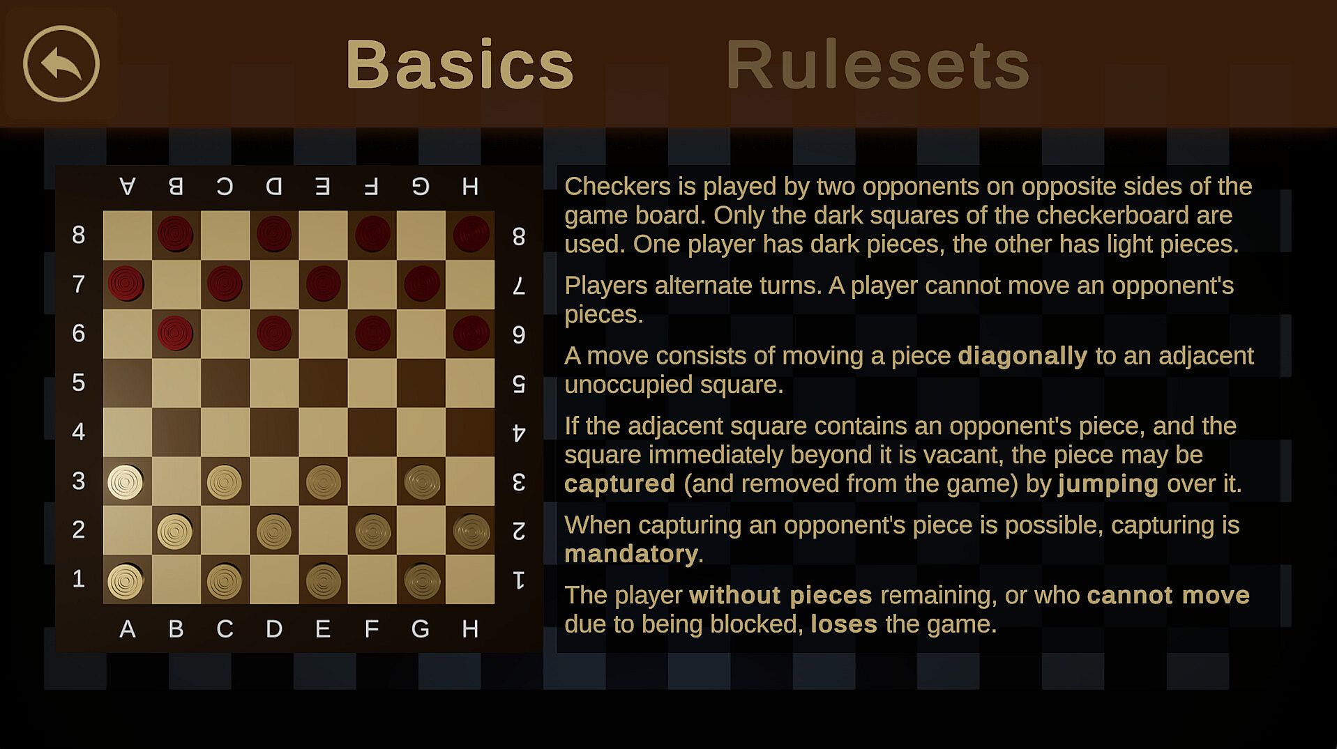 • Puzzles: English/US and Russian rulesets, a total of 40 fun puzzles which will help increase your understanding of different rulesets and make you a better Checkers player.