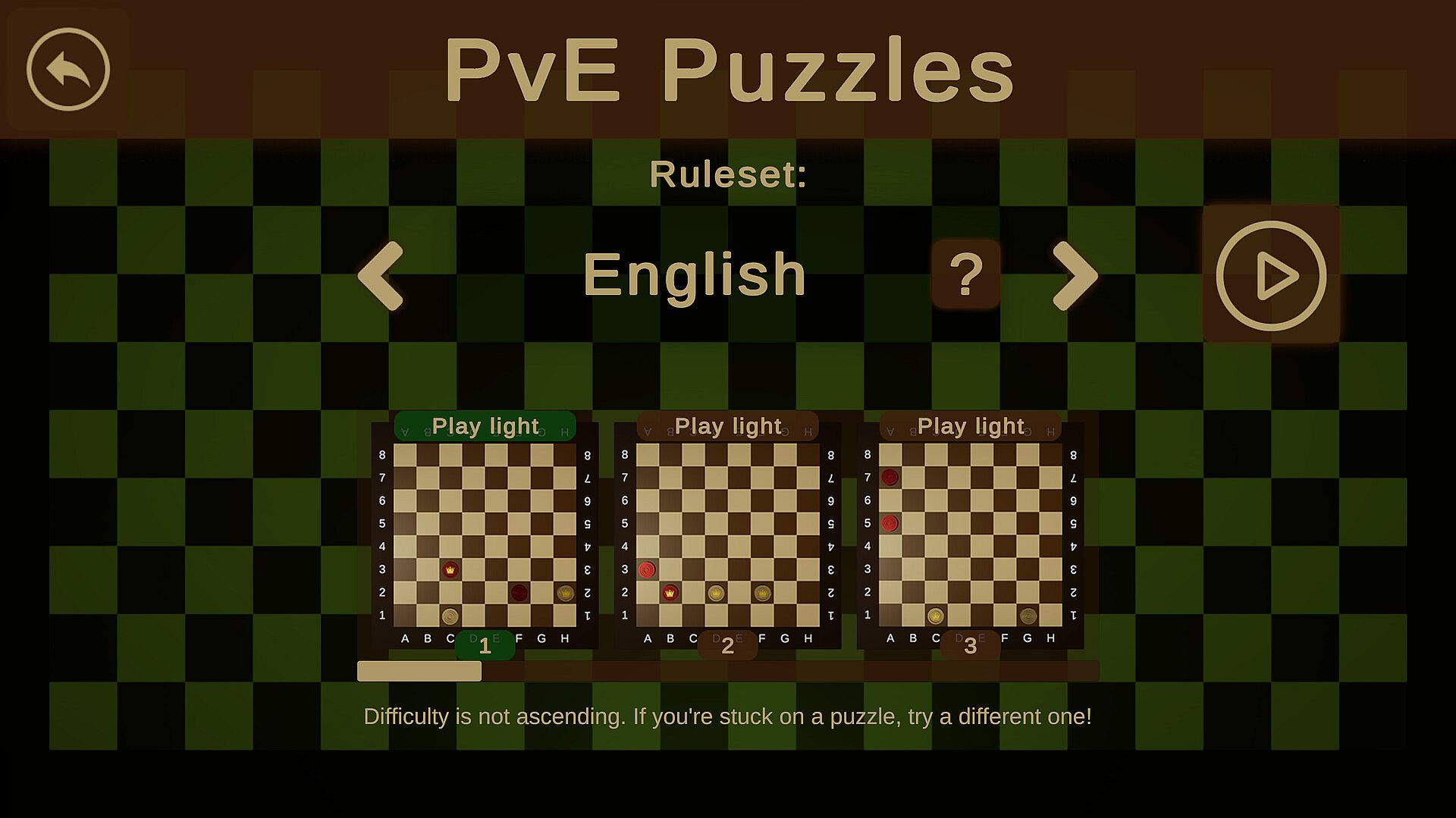 Play checkers with friends or strangers in shared, local, or online PvP matches. Challenge a single-player AI across three difficulty levels and four rulesets, including International, Brazilian, English/US, and Russian. Tackle 40 puzzles under English/US and Russian rules to sharpen your strategy. This casual strategy game suits players seeking relaxed multiplayer sessions or solo practice. PvE matches let you master varied rulesets at your pace. Puzzles build skills for better play in any mode.