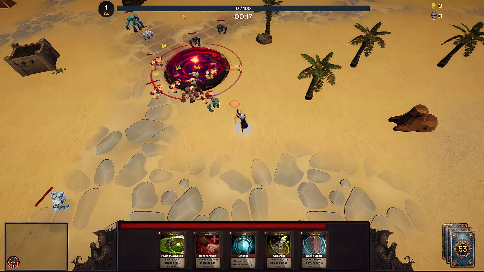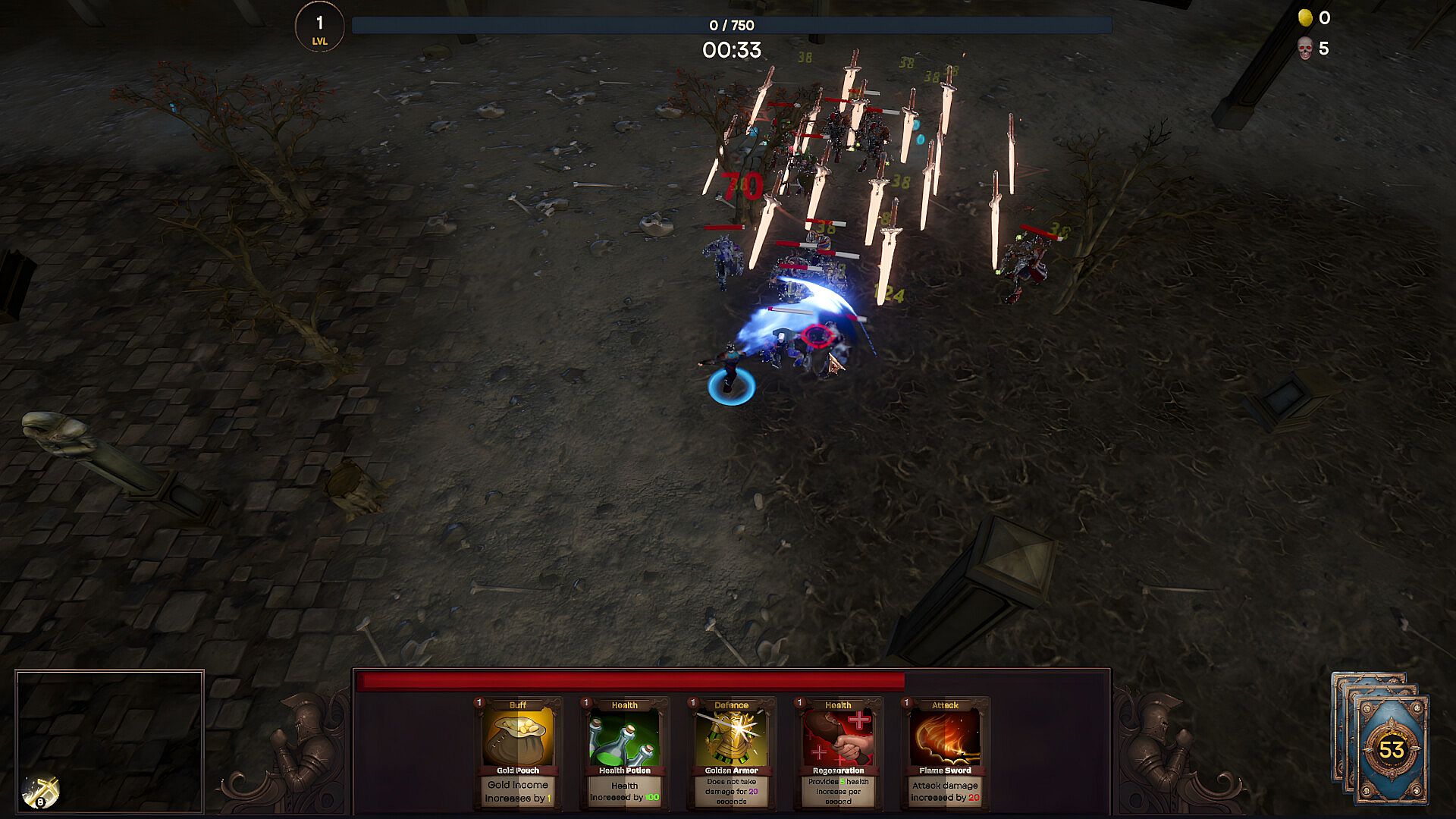In this strategic game, test your skills in clever card usage and effective strategy development to survive each level. Cards come in five different types: Attack, Defense, Health, Buff, and Speed, each offering unique strategic advantages. Defeat waves of enemies, collect cards, valuable equipment, and gold to develop your character. Strengthen your cards, shape your destiny by surviving the fine line between luck and strategy, and become a legendary warrior!