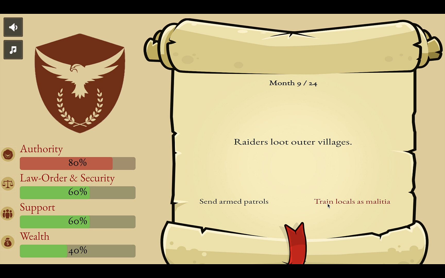 Every decision of yours echoes, tilting the pillars one way. Tip the value of any pillar to 0 or 100, and your legacy ends in flames - from rebellion, tyranny, chaos, or ruin. Victory only comes by maintaining a balanced rule.