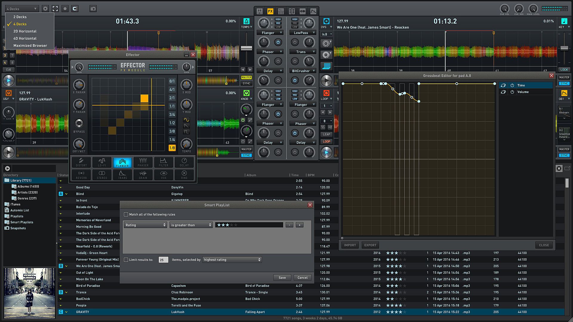 • Smart Utility Panels: Choose up to 8 panels per deck. Panels includes Loop, Cue, Grid, Key (tempo lock), SmartKnob, Tempo, EQ, Gain & Filter, Volume, FX Mix & Isolator, FX 1 to 3 and Gross Beat.