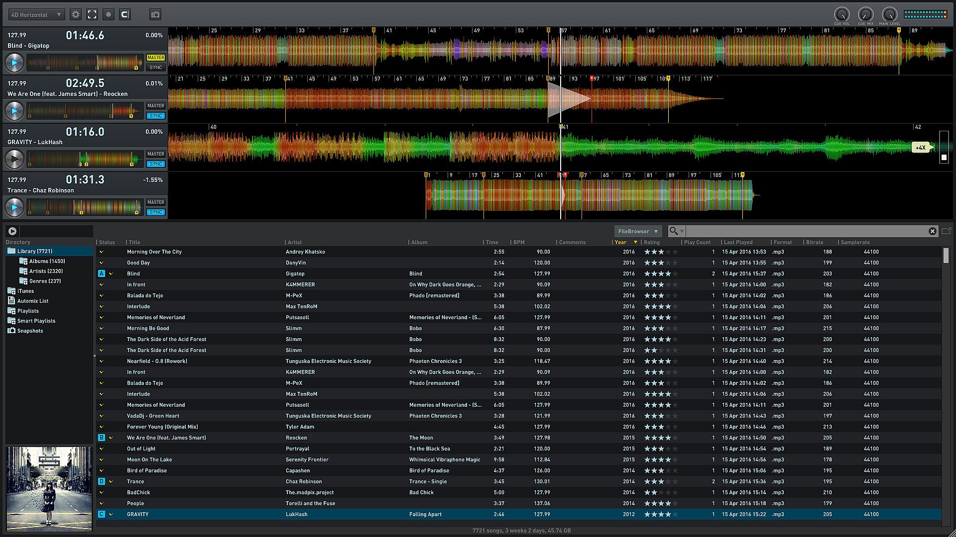 • Number of Decks: 2 or 4 Decks along with horizontal-layout views with miniature decks on the left and horizontal stacked and zoomable waveforms across the screen.