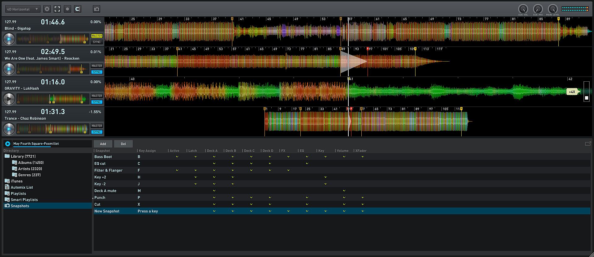 • Snapshots! Create and configure unlimited number of deck and mixer settings as you like and save them in a "snapshot" that you can later recall via assignable keyboard shortcuts (in momentary or toggle modes)!