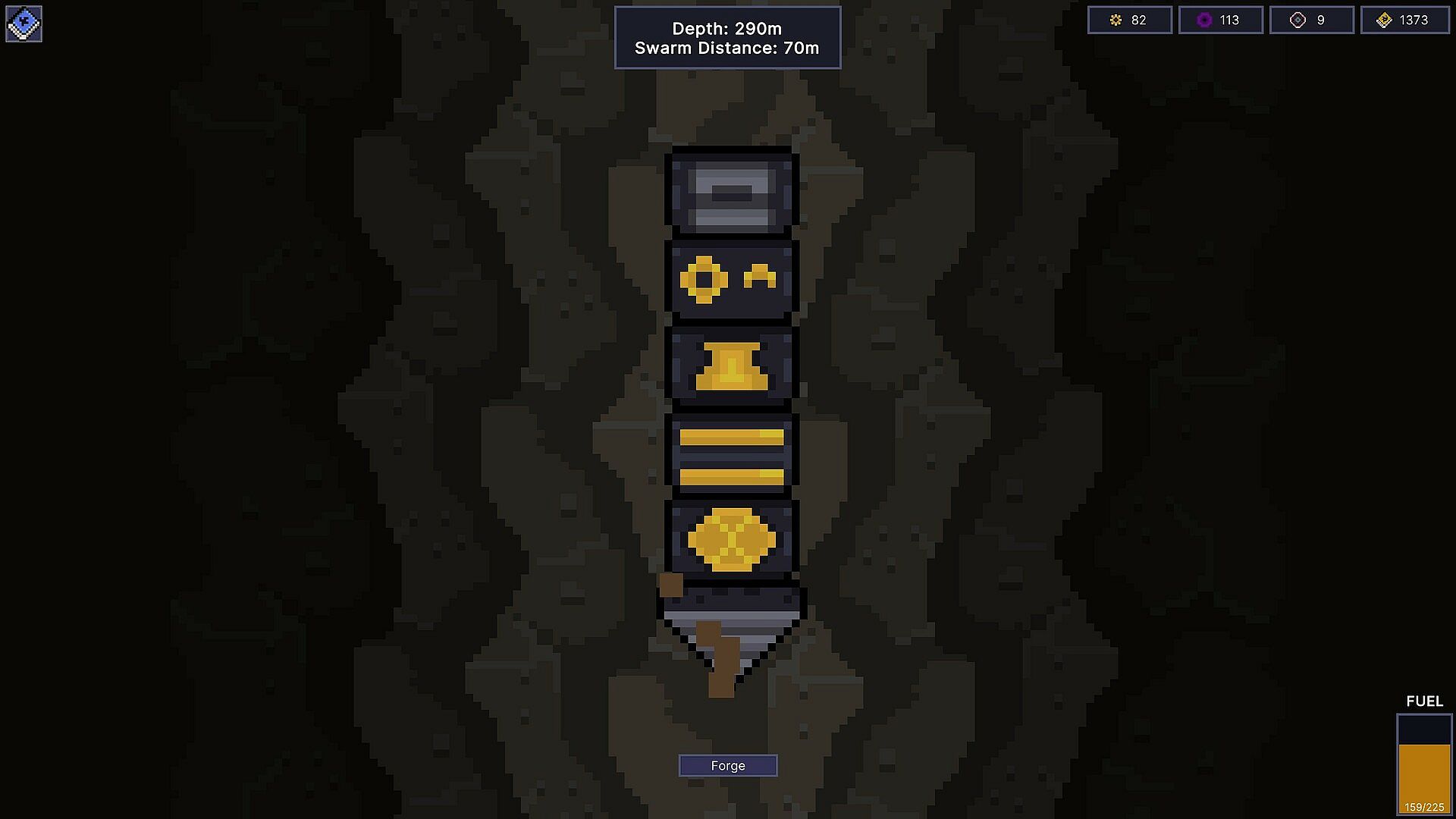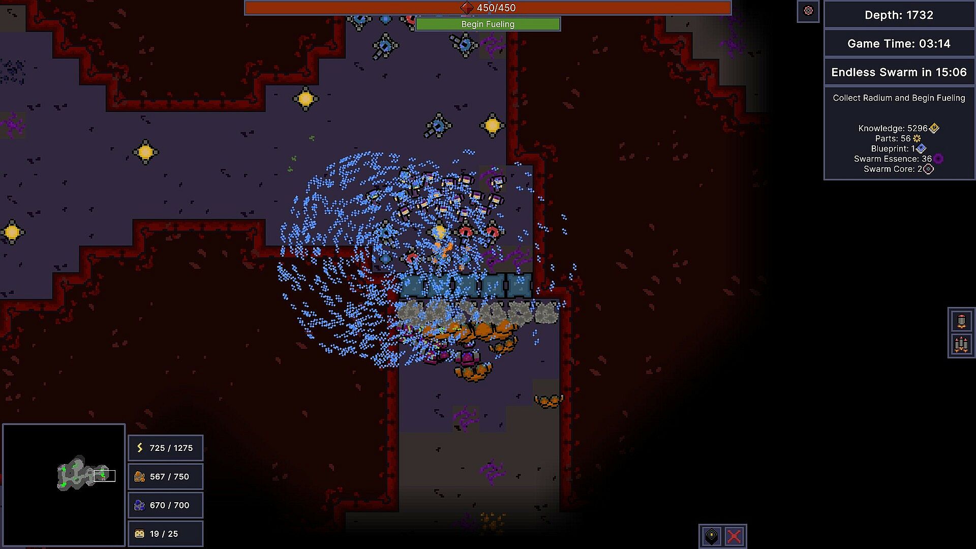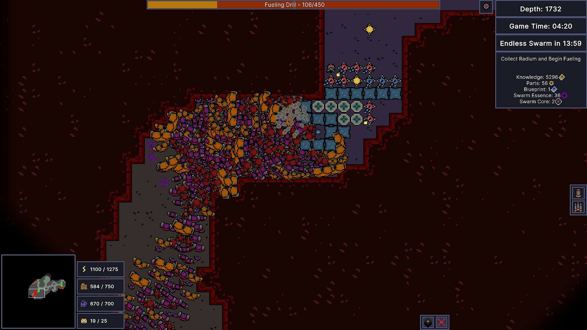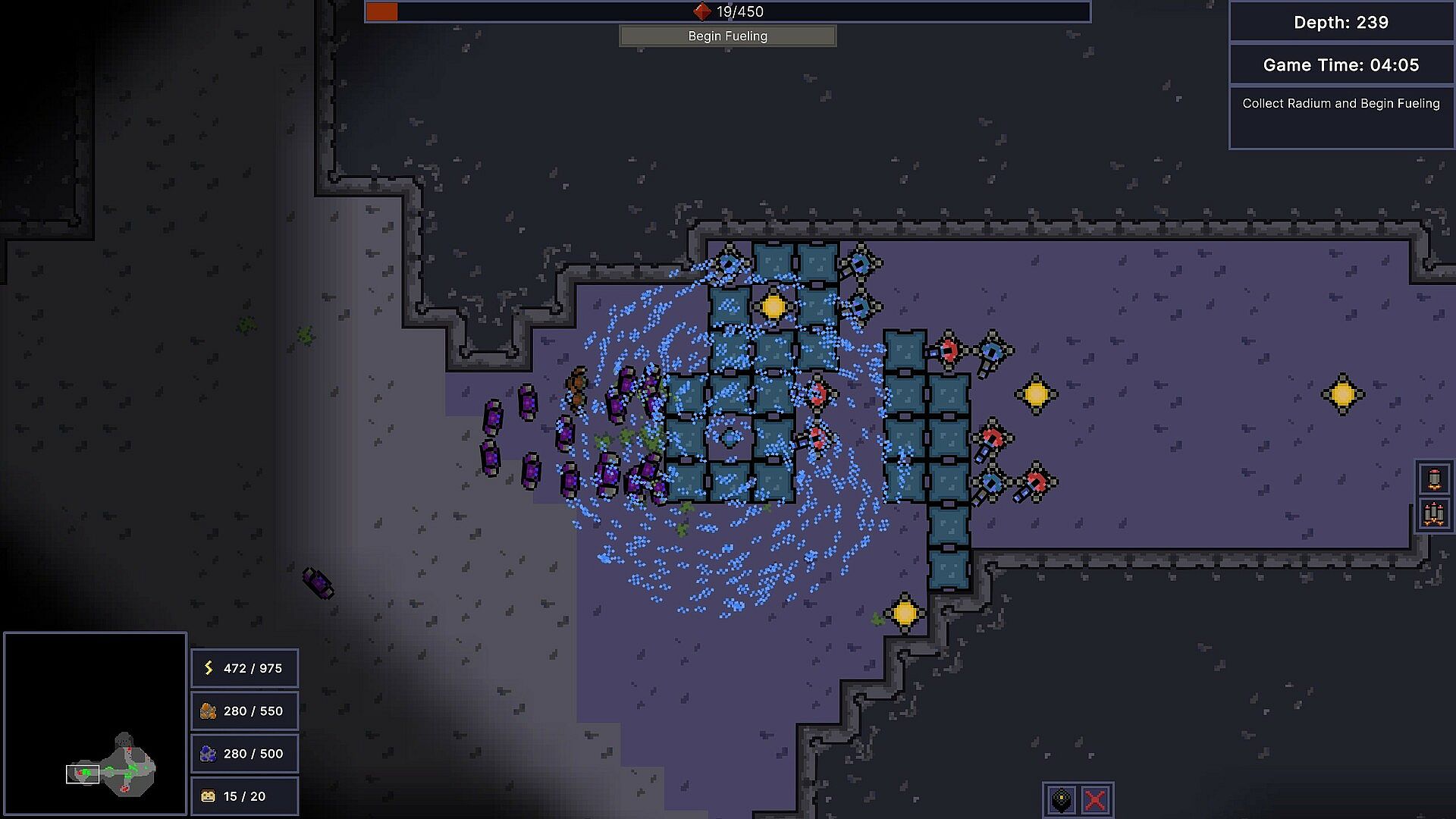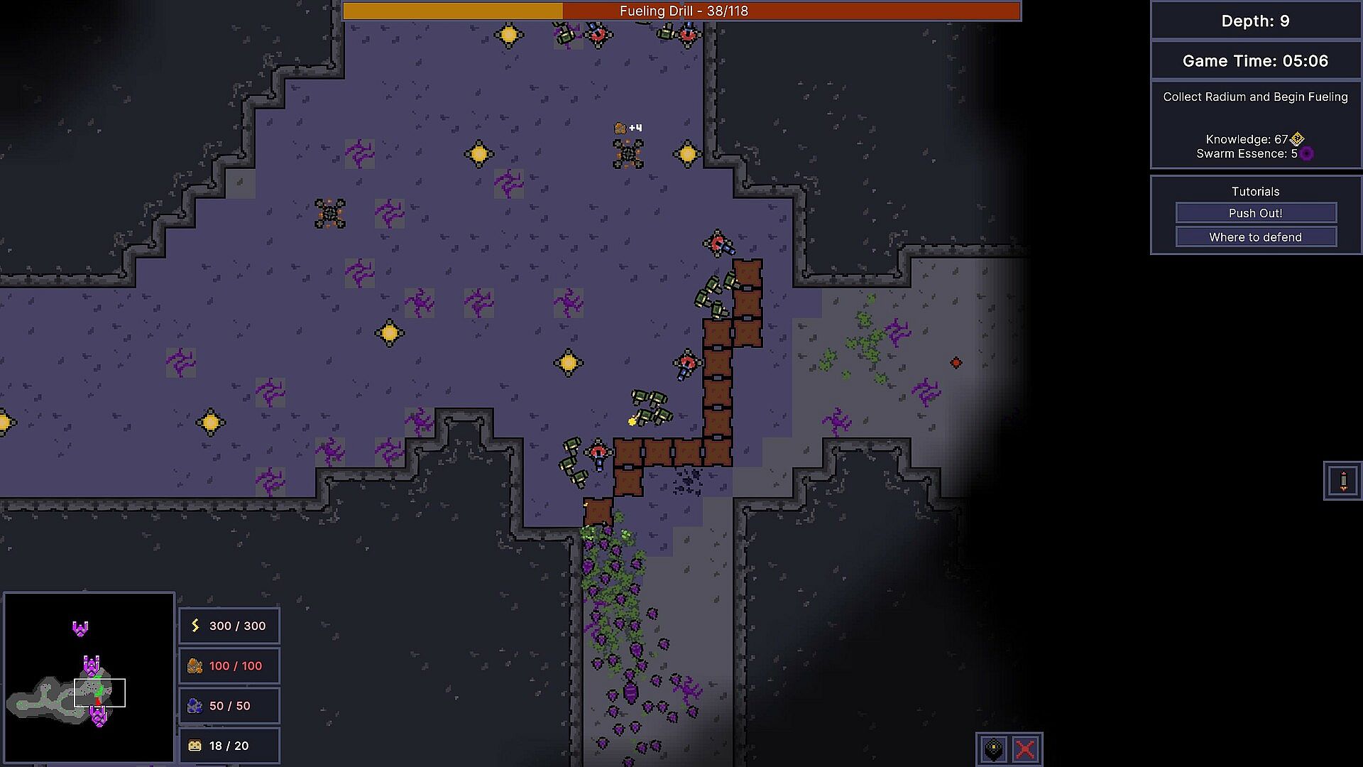Clear out and expand into as much of the darkness as you can. The more resources you control, the more powerful you can become. Your goal is to collect as much Radium to fuel your drill as you can. The more you collect, the deeper you can go.