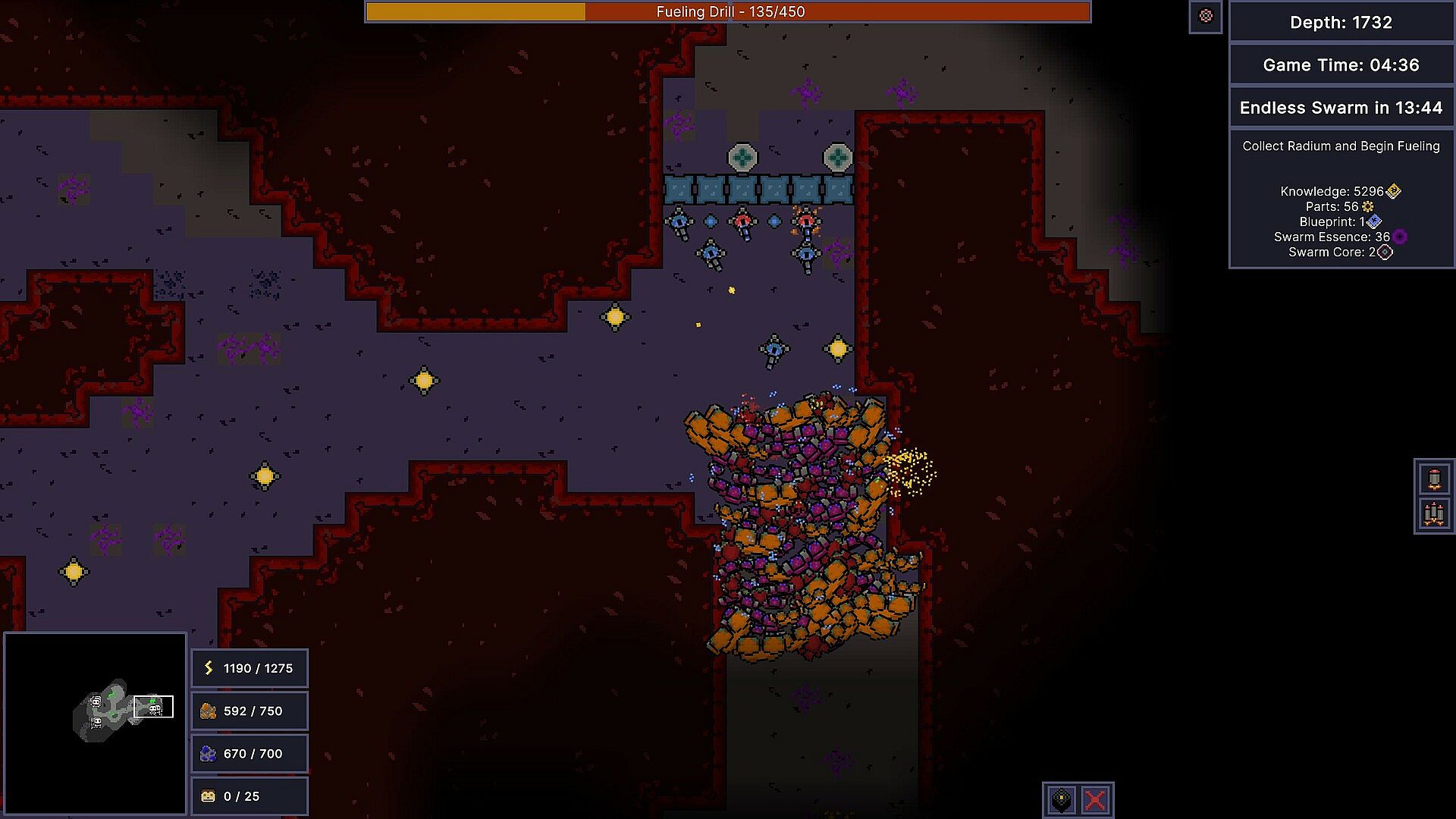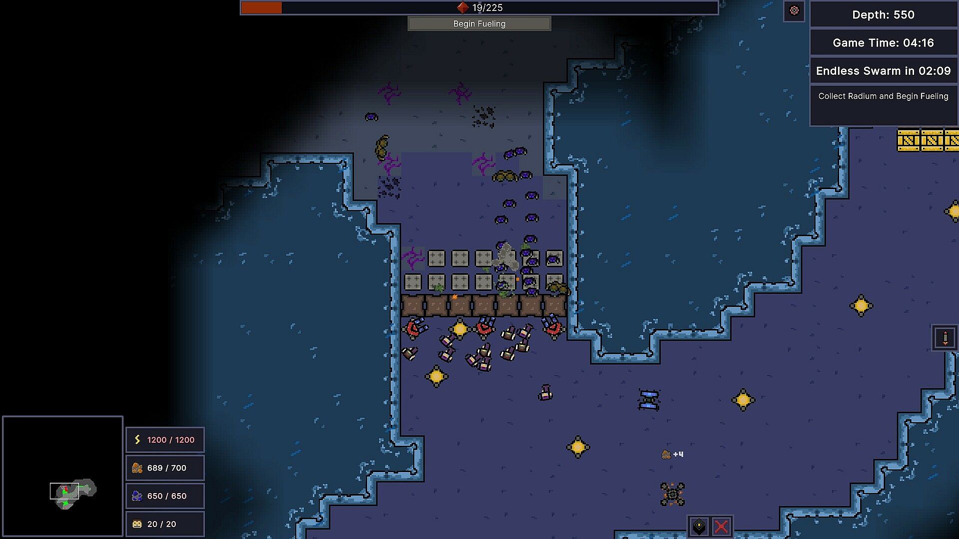 Once you start fueling your drill, a massive swarm of monsters will attack you. Setup defensive barricades and choke points to survive.