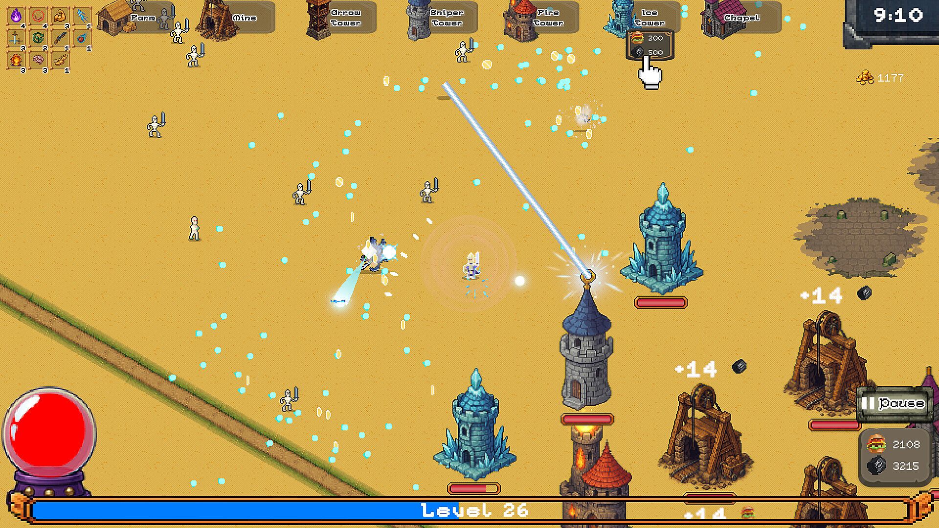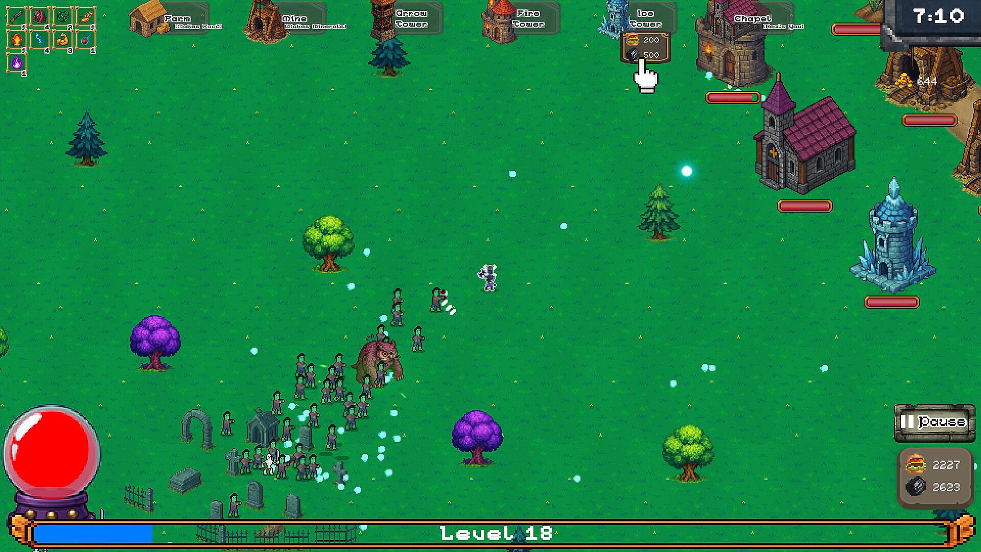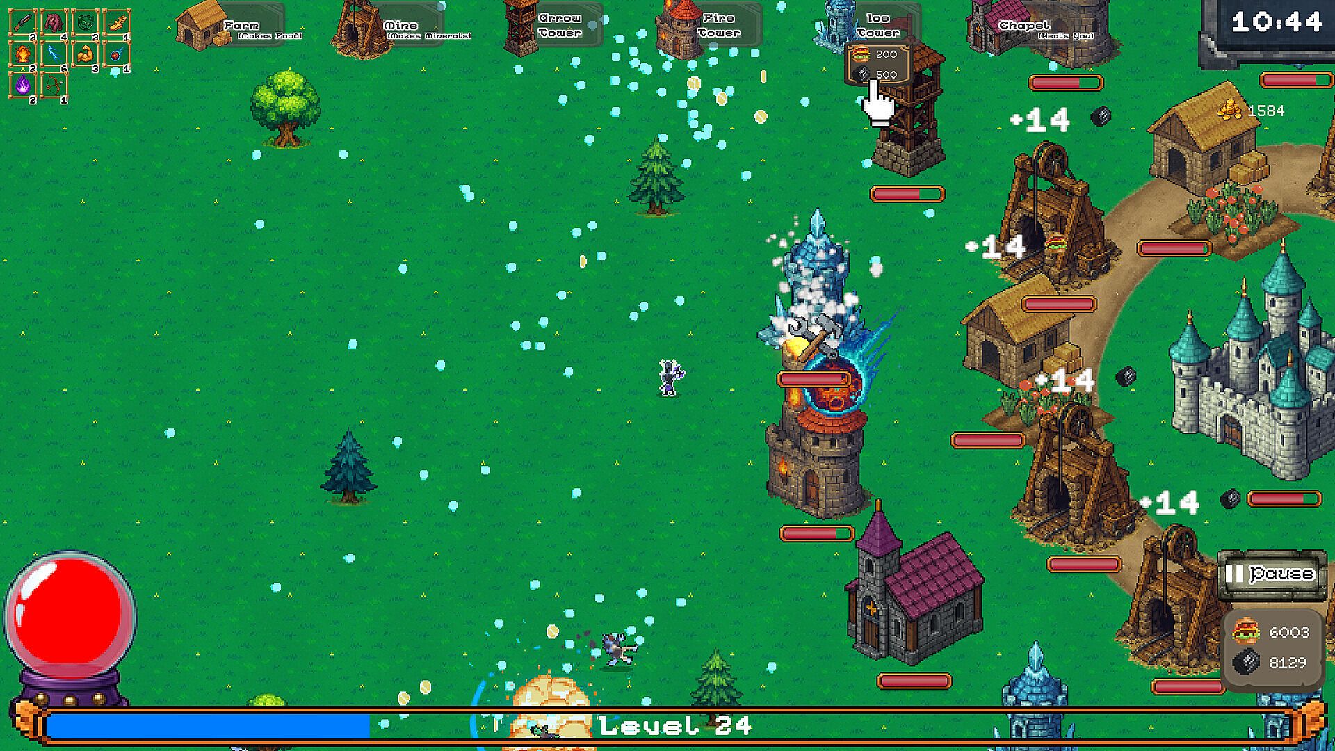 Build a town and keep it secure! Enemies approach from all directions, do you have what it takes to stop them? Stroll through town, set up buildings to produce resources, then use those resources to put up defense towers. With a growing collection of towers, bring the fight directly to your enemies. Collect experience points when you defeat enemies, and Level Up to choose bonus abilities.
