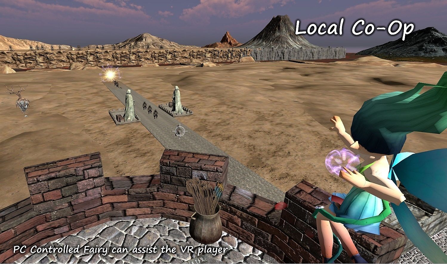 You can have a buddy help you out with the keyboard/mouse or gamepad. The second player joins in as a small flying Fairy, capable of shooting magic bolts and casting spells designed specifically for assistance (The Fairy is a support character). Local Co-Op can be used on majority of game modes and any play style (ie: Endless/Last Stand/Campaign), just press 'A' on your gamepad or 'Ctrl' on the keyboard to tag in as the Fairy. Spells include healing, shielding, fireballs and the ability to remotely guide the players arrows!