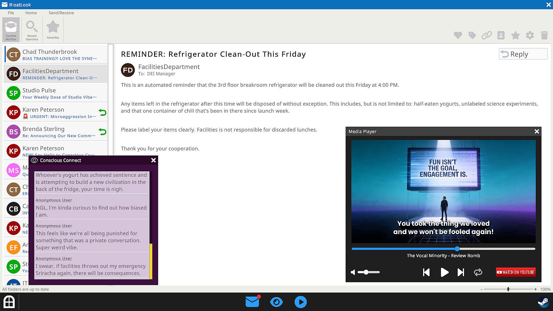 • Witness the Train Wreck: Watch the studio crumble in real-time through the "Conscious Connect" social feed, where your employees scream into the void about your policies.