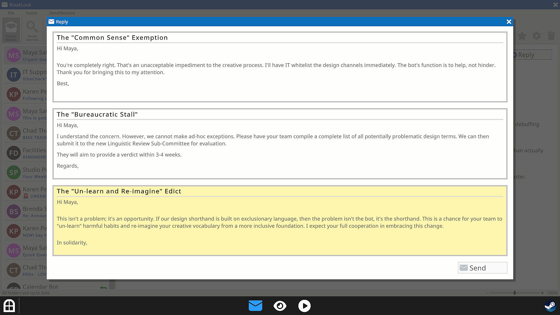 • Choose Your Poison: Will you ruin the team's morale with a mandatory 8-hour seminar or an intrusive personal survey? It doesn't matter! The studio will burn either way, but at least you get to pick the color of the flames.