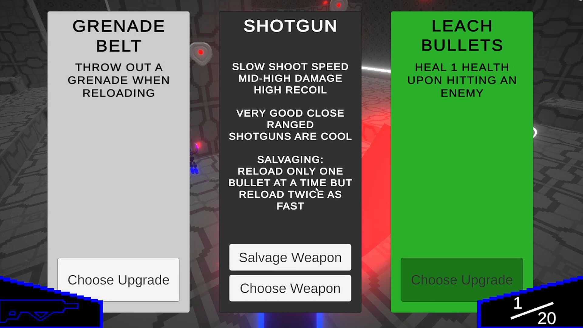 The game varies over 50 waves with a final boss at the end. Every wave, new enemies spawn and the arena changes to a new layout previously created in the level editor. Killing enemies gives Xp that can be used to grant a choice of 3 upgrades of varying rarities, maybe even a new weapon. At wave 50, if you don't want to fight the final boss just yet, you can wait a while and loop for another 50 waves with a lot stronger enemies to get new upgrades.