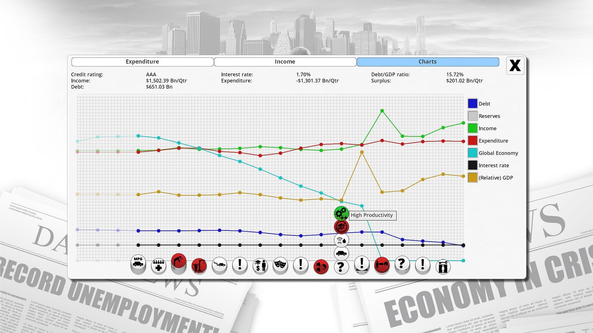 Despite being vastly detailed under-the-hood, Democracy 3 has a unique user interface that makes visualizing the connections between laws, policies, voters and situations easy. A simple iconic-based view of your countries issues allows you to 'drill-down' through all the relationships between policies and voters to quickly analyze the impacts of your decisions. Your trade policy may affect GDP, which will affect unemployment, which will effect poverty, and thus crime, leading to a change in tourism, which affects GDP...Complex simulated voters