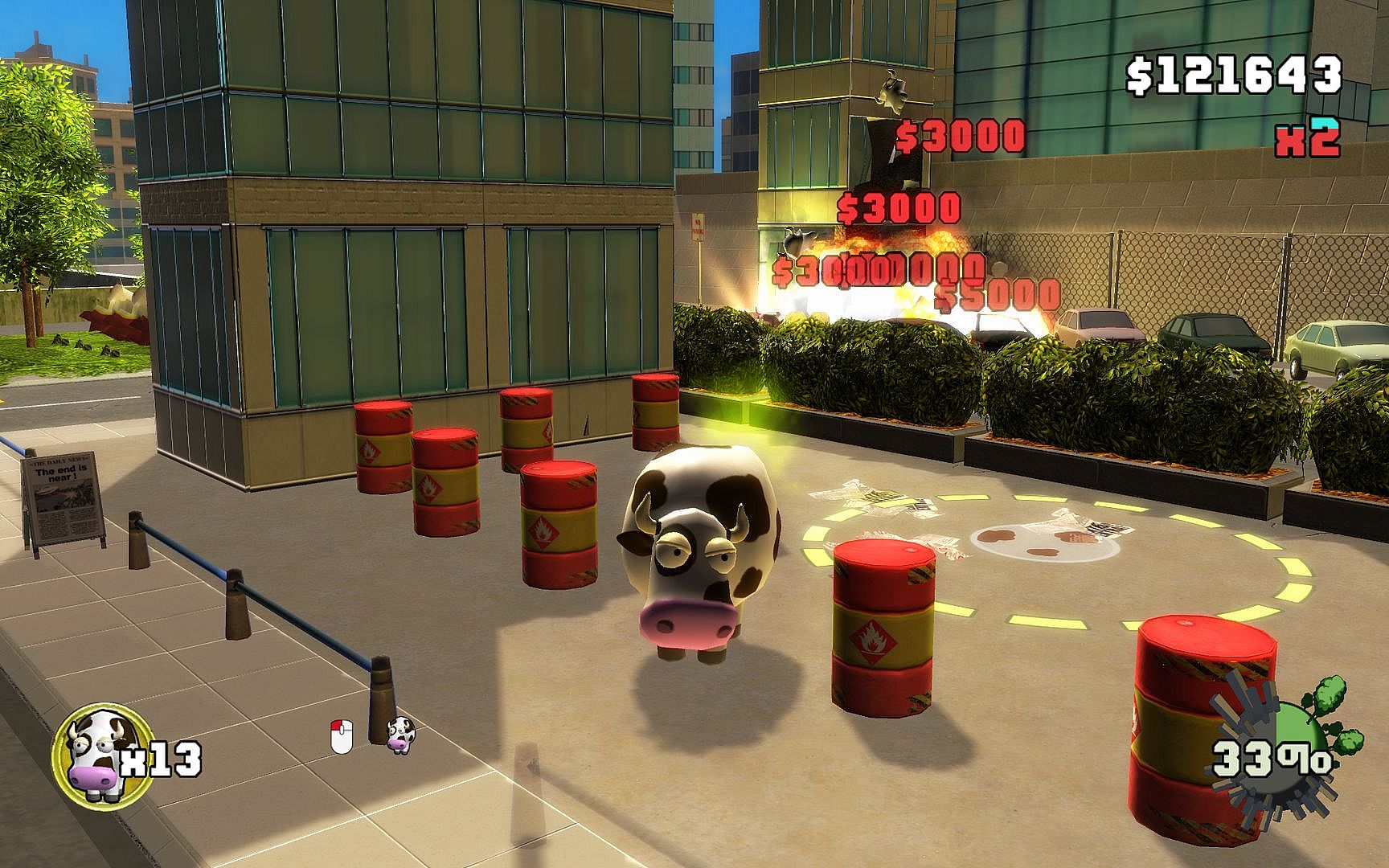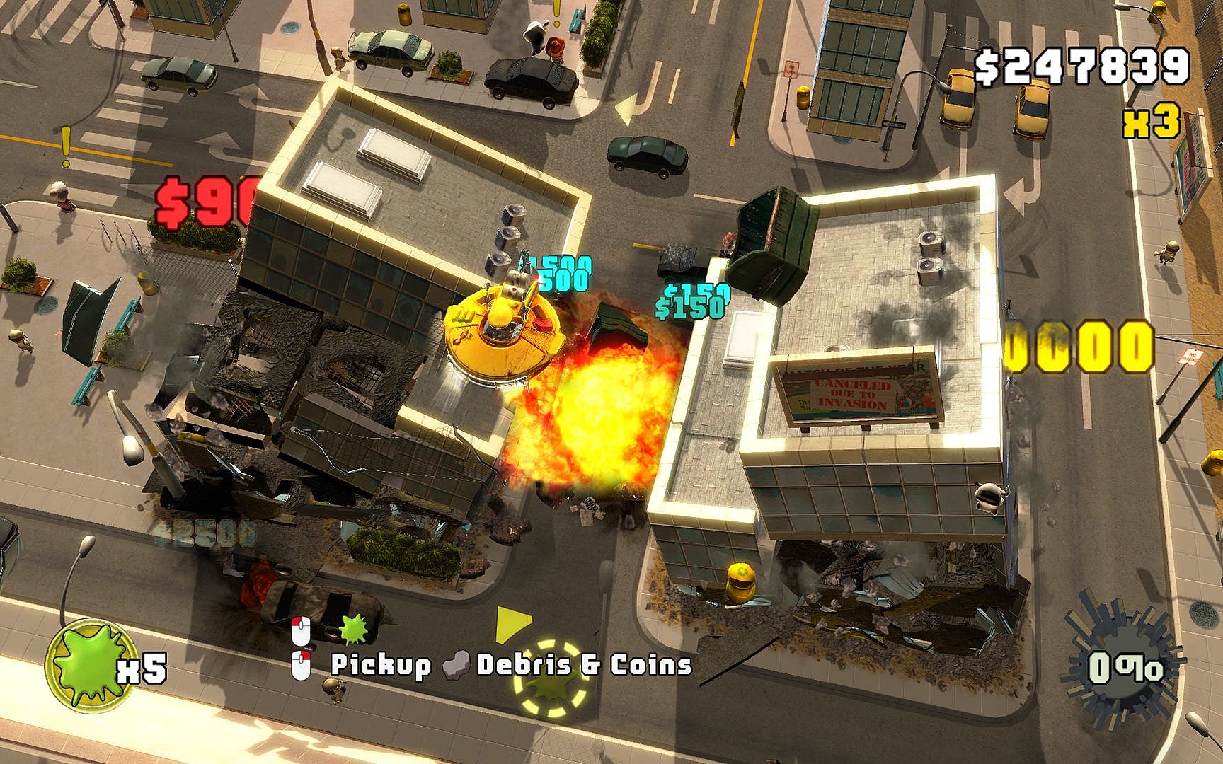 Navigate Mike's UFO over cities of earth and unfold complete chaos with your tools and weapons: Cars which drive into tower blocks and let them collapse, high-rises which fall onto other high-rises, and exploding cows which let whole streets of houses come tumbling down!