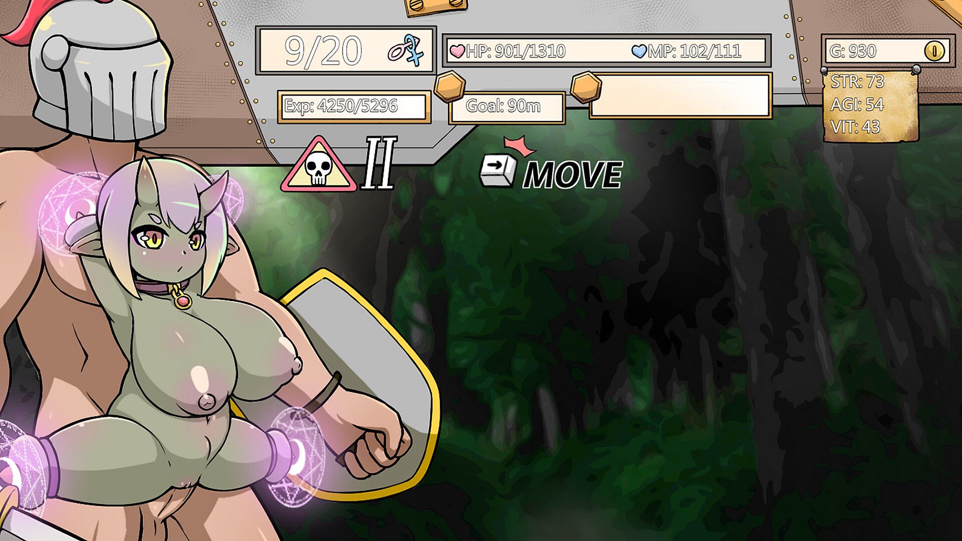 However, as a Knight of the Fleshclad, you can only gain power when you have intercourse with a woman. To do this, your companion Goblin Lilly becomes your Fleshclad and hangs in front of you in a shameful position, only in this way you can realize your true power.