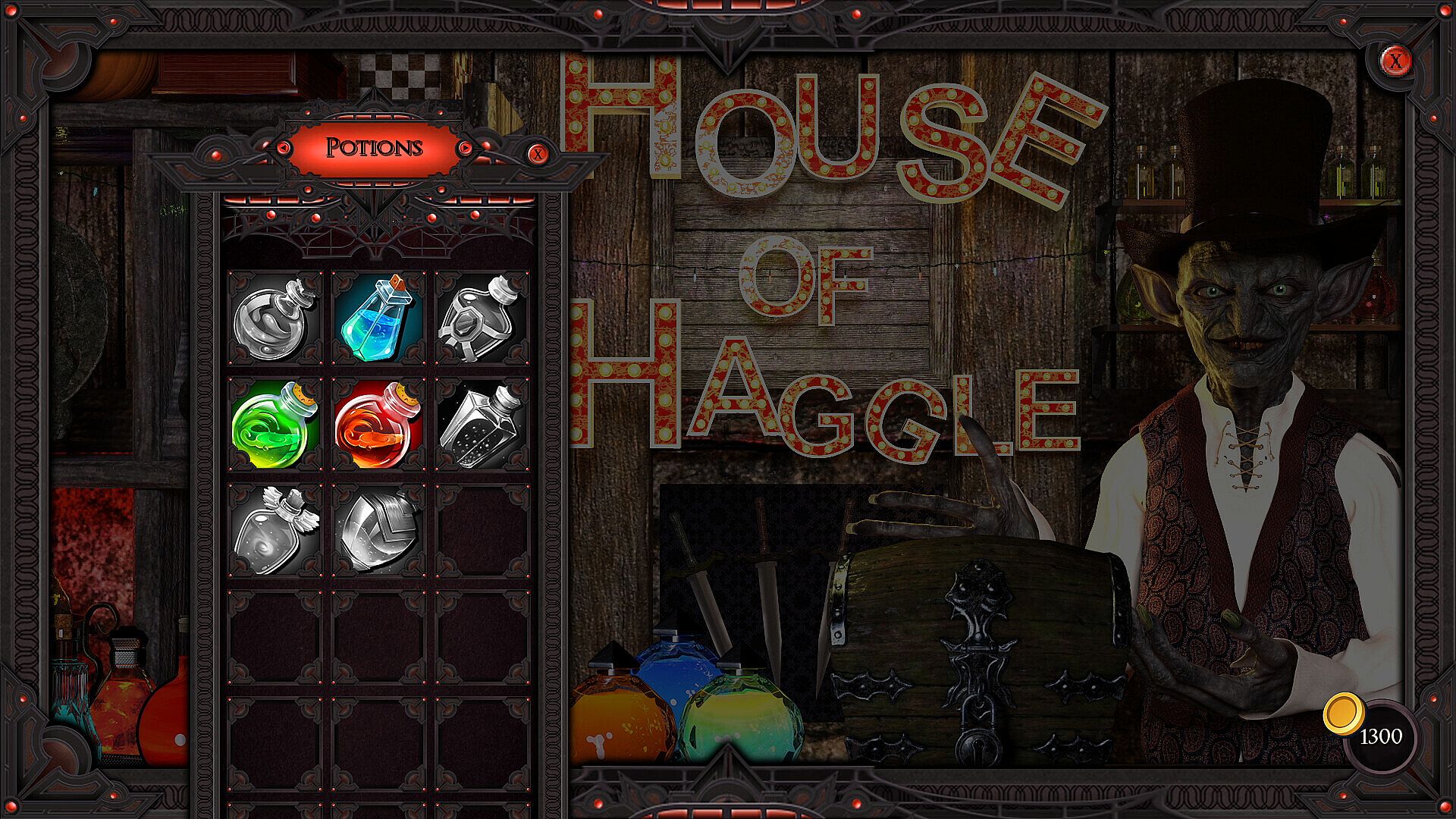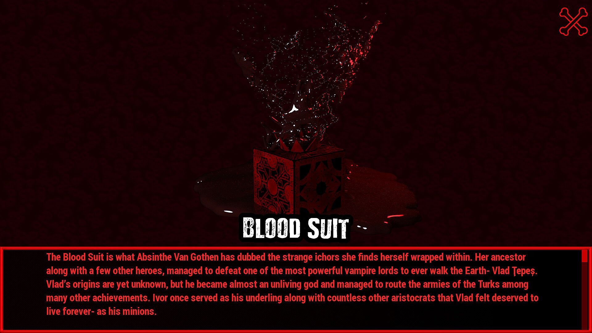 The main gameplay aspect of Game Mode is playing as the fledgling monster hunter, Absinthe, and navigating through maps. By slaying monsters on your hunts, you will gain gold which you can spend at the House of Haggle, a whimsical shop ran by the sordid hobgoblin, Hobs Hornswaggle. You can buy weapons and potions from him. By utilizing different weapons and attacks you will be able to defeat the myriads of monsters. Some items can even instantly slay a foe, like silver bullets defeating a werewolf. The potions act as stat boosters, giving Absinthe greater abilities to help counteract the creatures’ attacks. And, after each hunt, you can choose to learn how to better utilize weapons, or become more intwined with the Blood Suit, corrupting yourself for greater powers.