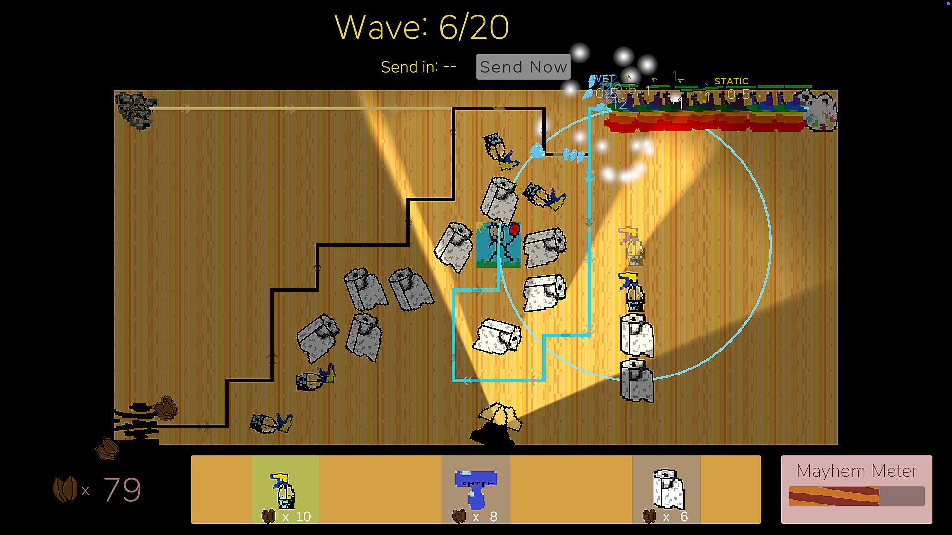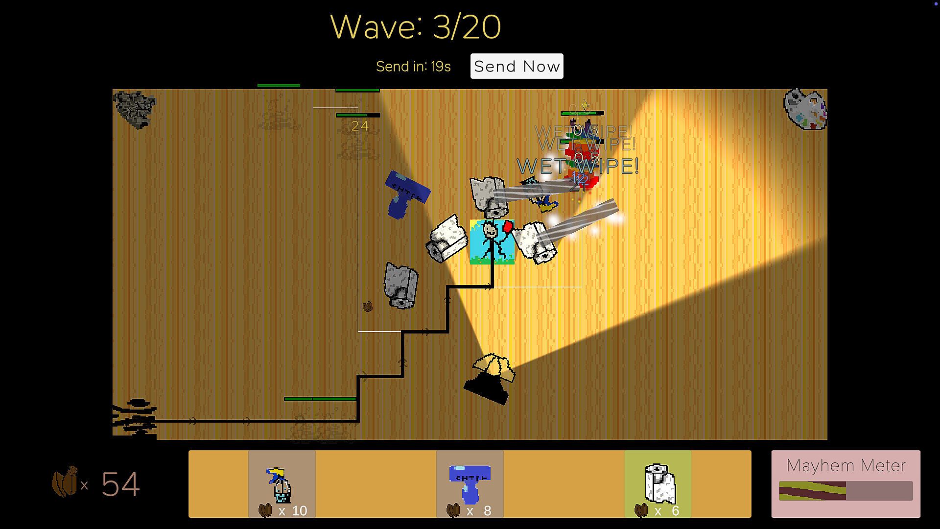 In Desk Defense, you place cleaning tools on your desk to block, reroute, and scrub through incoming waves of dust, dirt, paint, charcoal, cat hair, and other clutter threatening your precious project. Your glorious, static-charged lamp is the center of your strategy: reveal threats, boost nearby tools, and set up powerful combo plays.