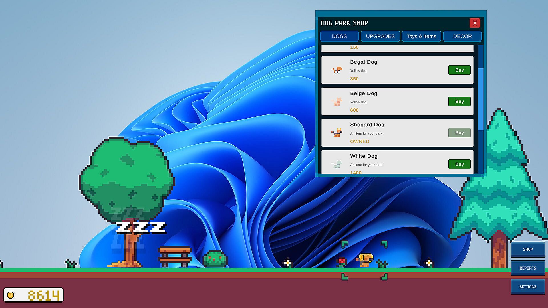 Desktop Dog Park is a idle game that lives at the bottom of your screen. It stays running while you do other things, letting you check in on your dogs whenever you want.