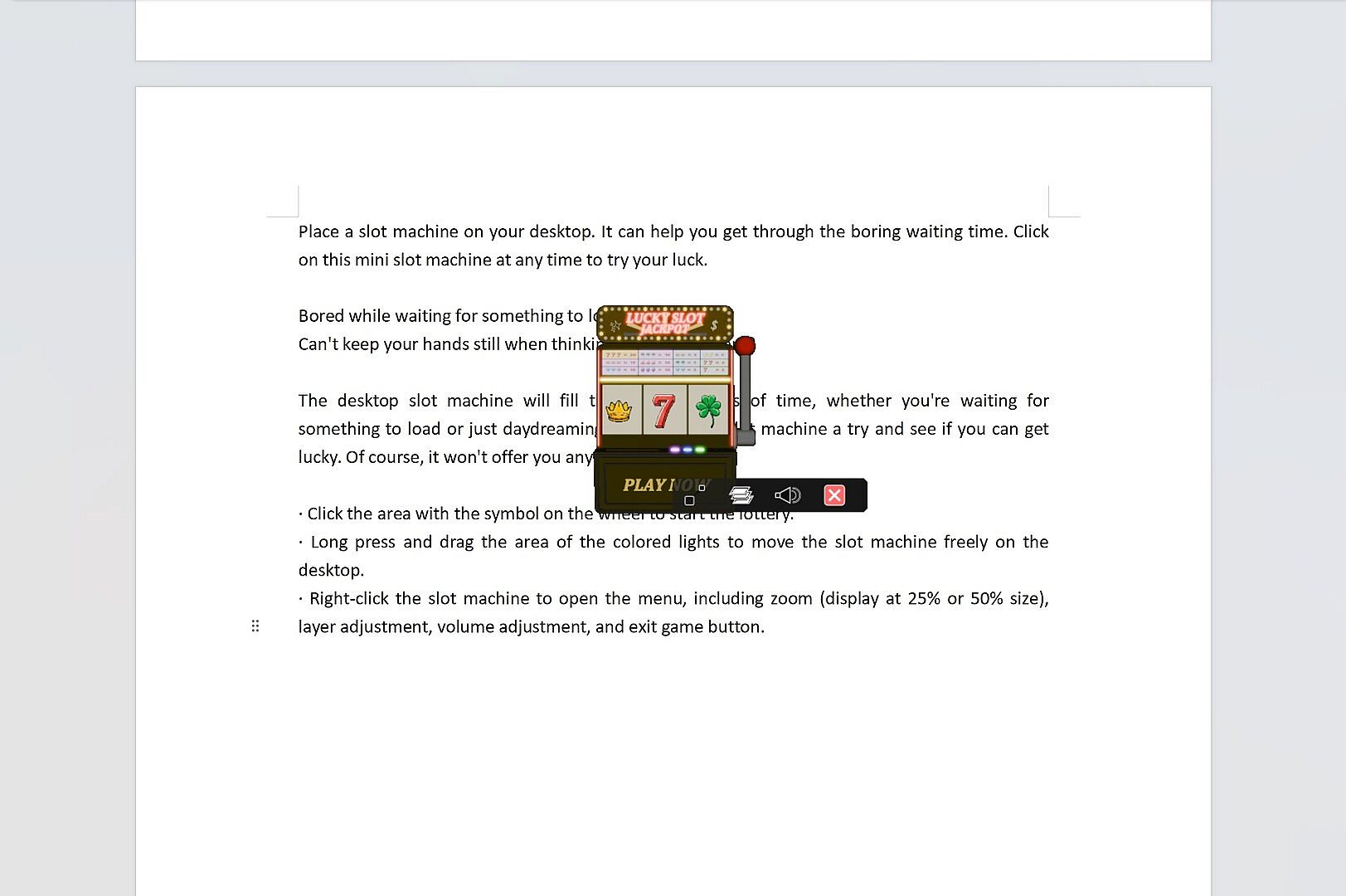 · Right-click the slot machine to open the menu, including zoom (display at 25% or 50% size), layer adjustment, volume adjustment, and exit game button.