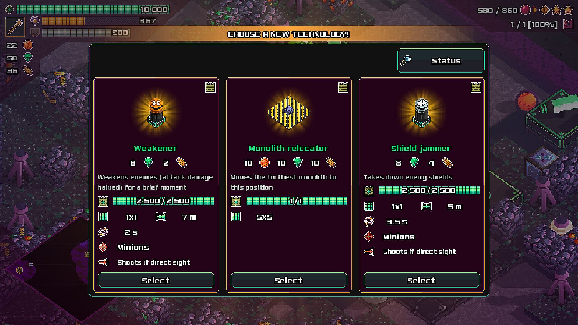 Place buildings to protect your base and attack enemy monoliths. Combine and synergize buildings from four different categories: offensive, status effects, support and biome specials.