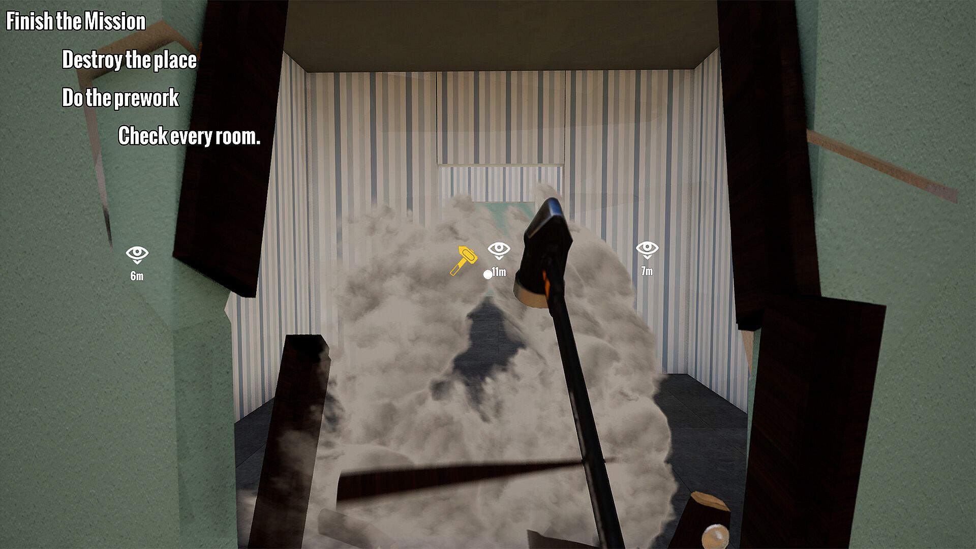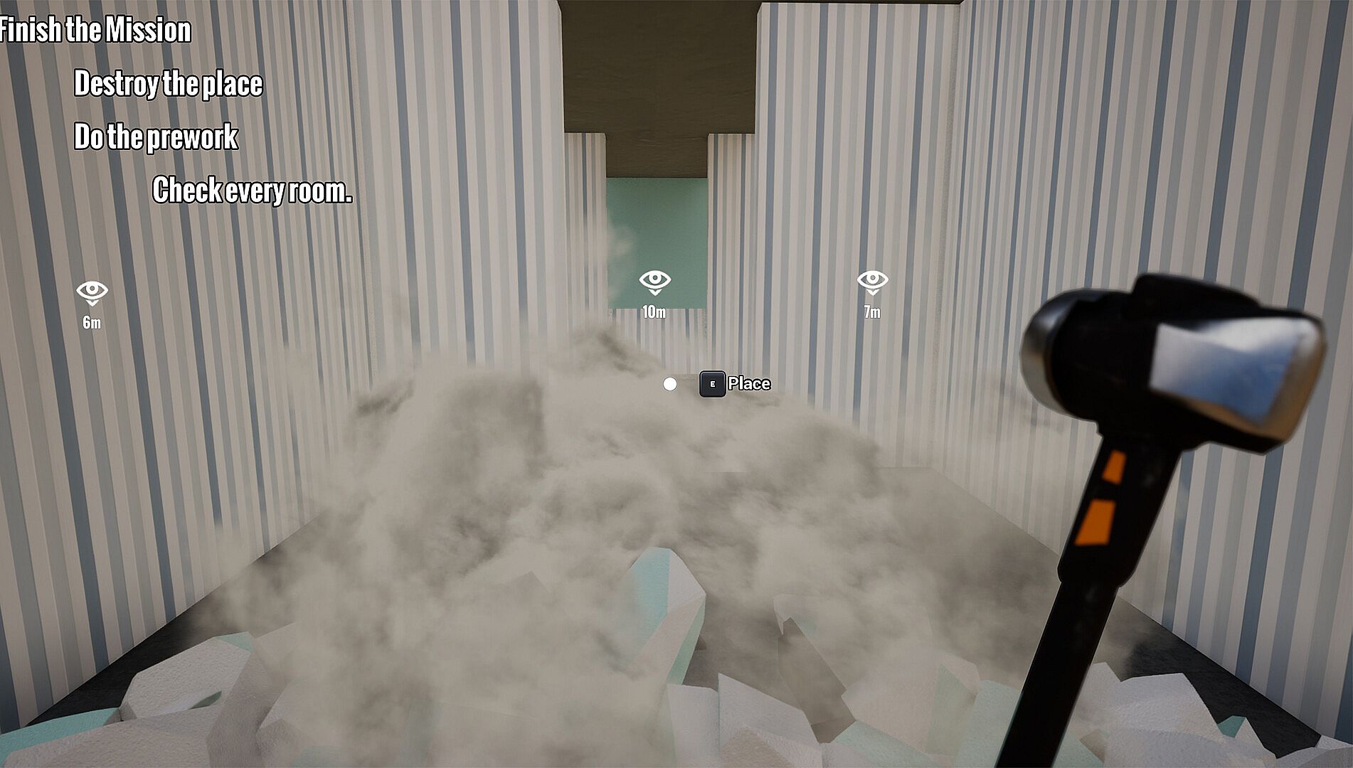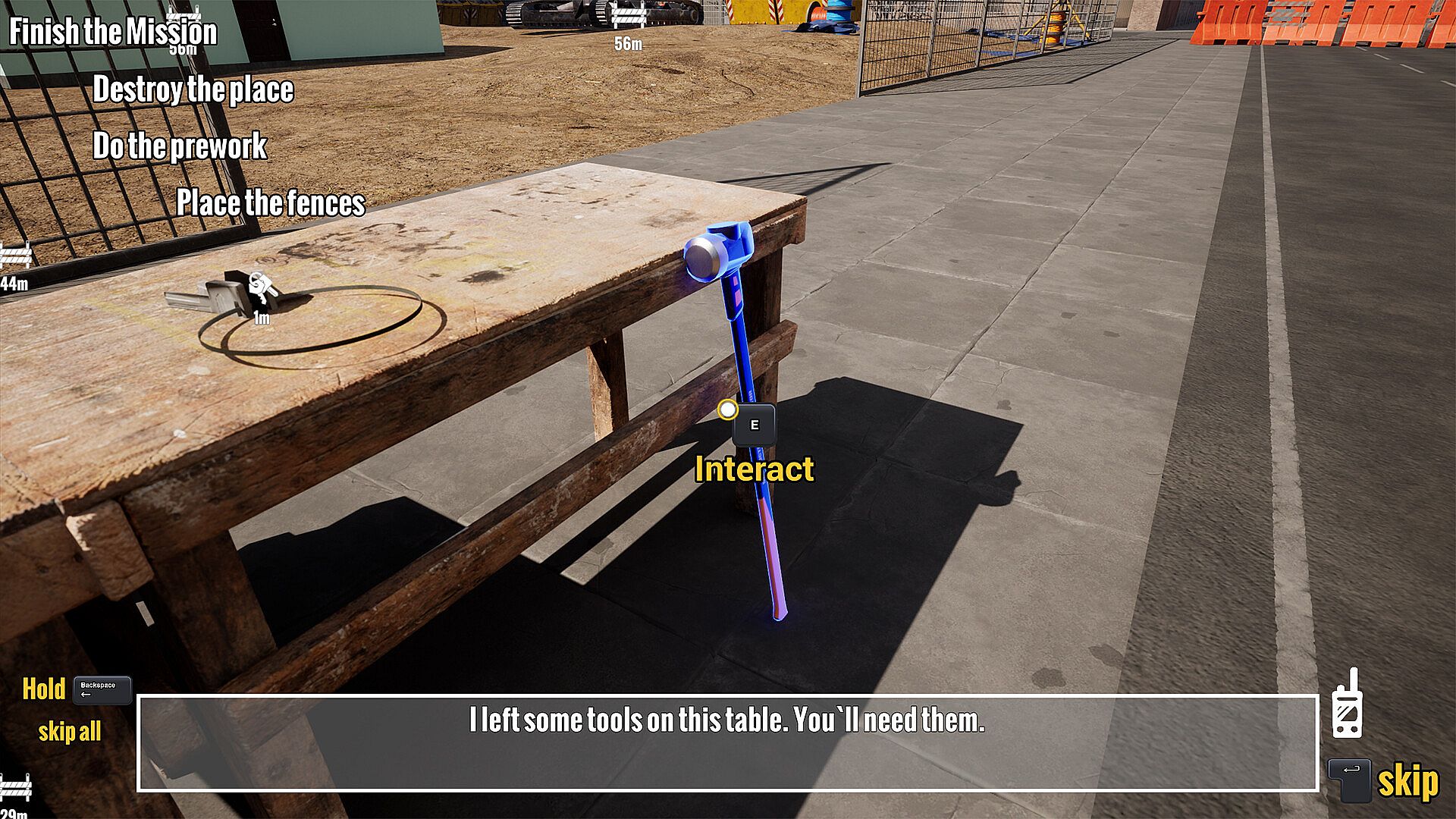 Each work assignment consists of several alternating sub-tasks that must be completed to do a perfect job and get a higher final assessment. These task can very between ensuring the safety of the construction site by placing fences and moving old furniture that has been left behind out of the building. The overall assessment of your performance determines your pay for the assignment, which can be used to buy new or improved tools.