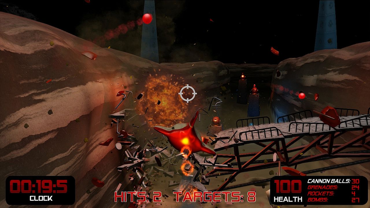Player flies pod through obstacle course, collects ammunition, and destroys all primary targets. Primary targets are cannons, UFOs and satellite dishes. Once all primary targets are destroyed, player must find the finish line to end the level.Each level has a max time, the maximum amount of time it should take to destroy all the primary targets and finish. Bonus points are earned by improving on the max time. Collateral damage is rewarded. Bonus points are earned by the percentage of the level that is destroyed. All primary target direct hits are also rewarded with bonus points plus additional ammunition.