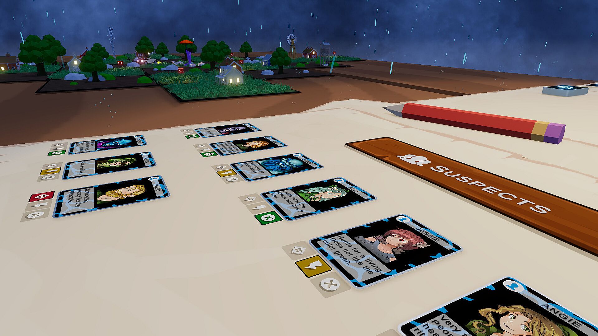 • Collect Clues: Find clue cards scattered across randomized maps, that reveal the target’s appearance, habits, or secrets.