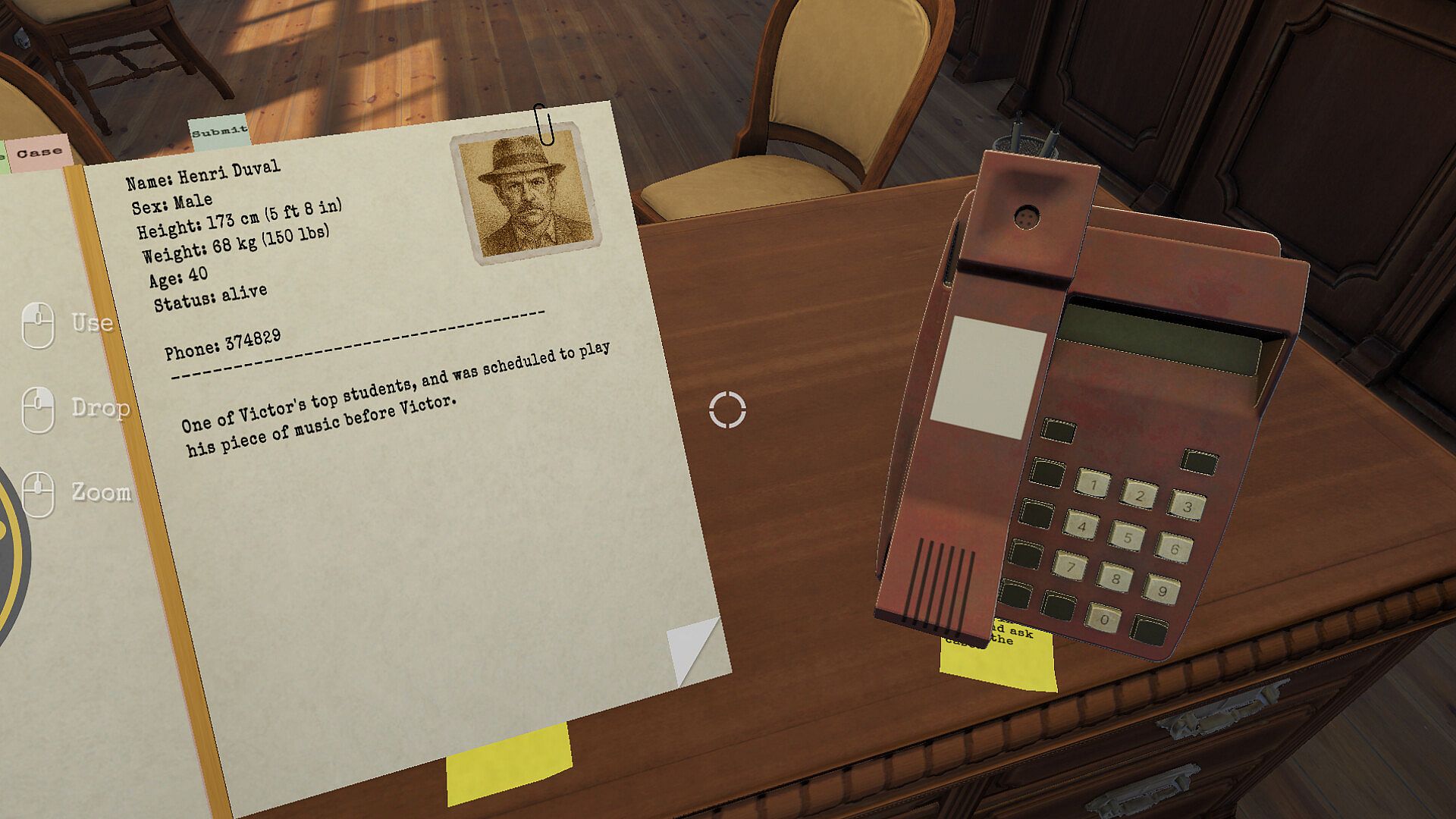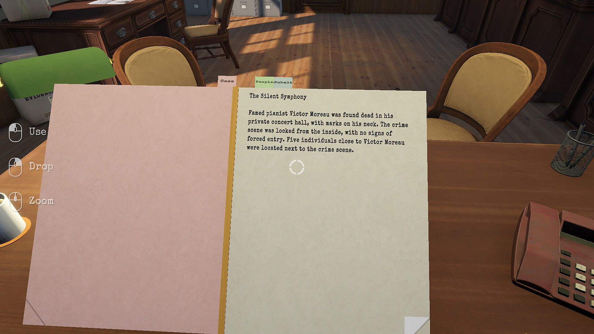 Use your case file to study the evidence and learn about the people involved. Apply sharp deduction to figure out who did it, why they did it, and how it all happened.