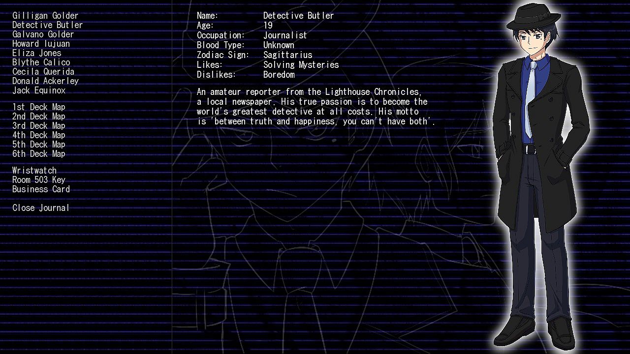 Visual novels are story-based games, displaying characters on the screen while playing sounds and music in the background to create an immersive storytelling experience. Although most visual novels include branching paths and choices that affect the outcome of the story, Detective Butler: Maiden Voyage Murder has just one outcome. The only choice is how you choose to solve the mystery.