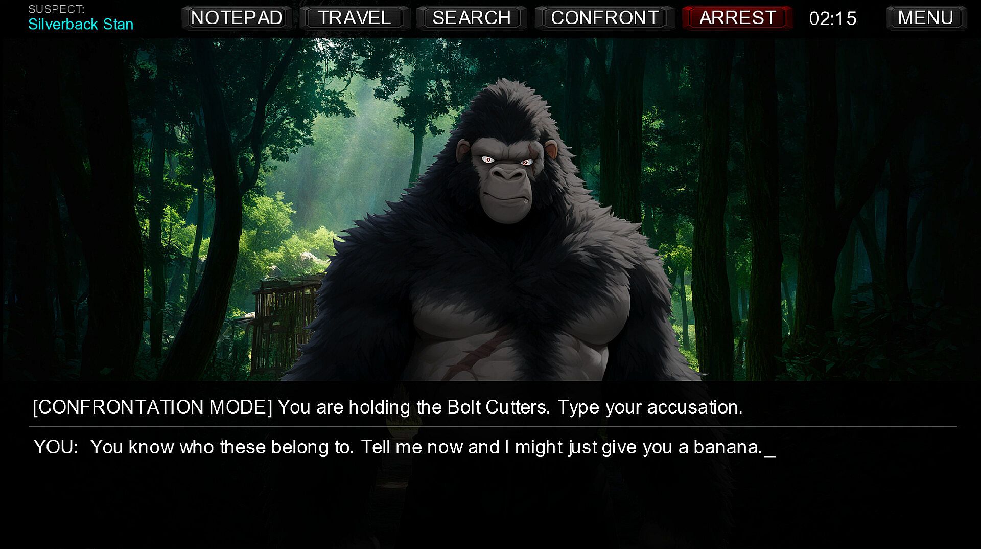 You are Detective Turtletop, a hard-boiled reptile with a lust for justice. You have 3 hours to interview the witnesses, collect physical evidence, and sign an Arrest Warrant before "Big Zoo" moves in to sweep the murder under the rug.