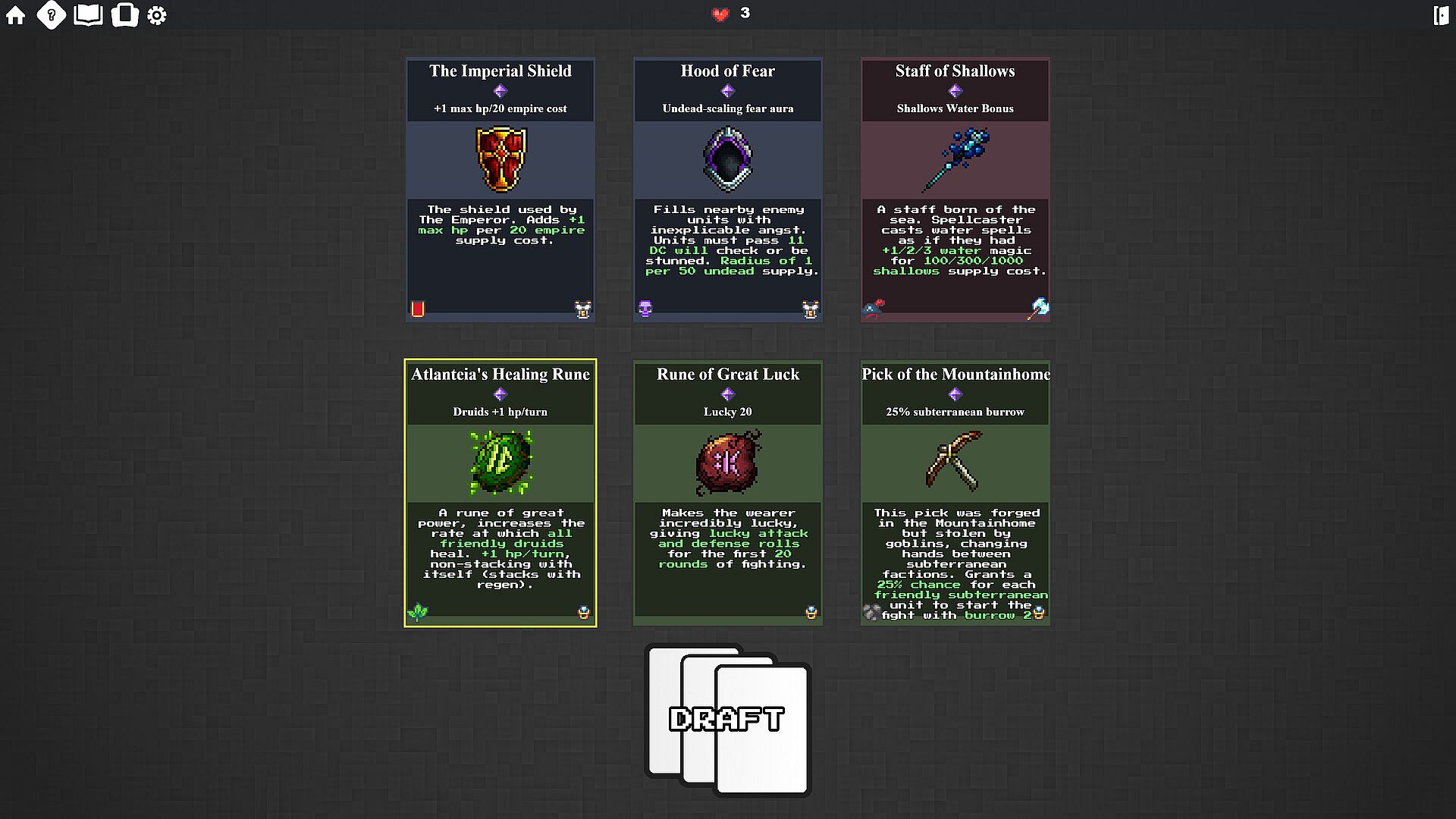 Every game of Deus Proxy is a possibility to try new strategies and find new synergies! There are no implicit faction bonuses, all bonuses come from items and spells related to that faction. Your plant-based army might focus on empowering ranged units to entangle far-away targets, giving army-wide regeneration bonuses to make your treants walking tanks, or just being immune to the acid rain your mage caused. Because you have 1-3 battles per turn, it is vital to keep your armies adaptable for each new challenge!