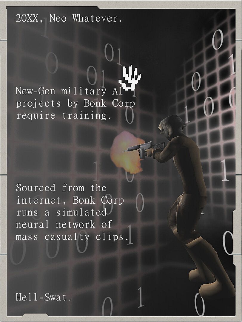 Military AI needs training. Bonk Corp provides. Training AI on a simulated stream of swat videos and mass casualty events. Run through various procedural levels and get scored based on the amount of time you take and how many enemies you slay.
