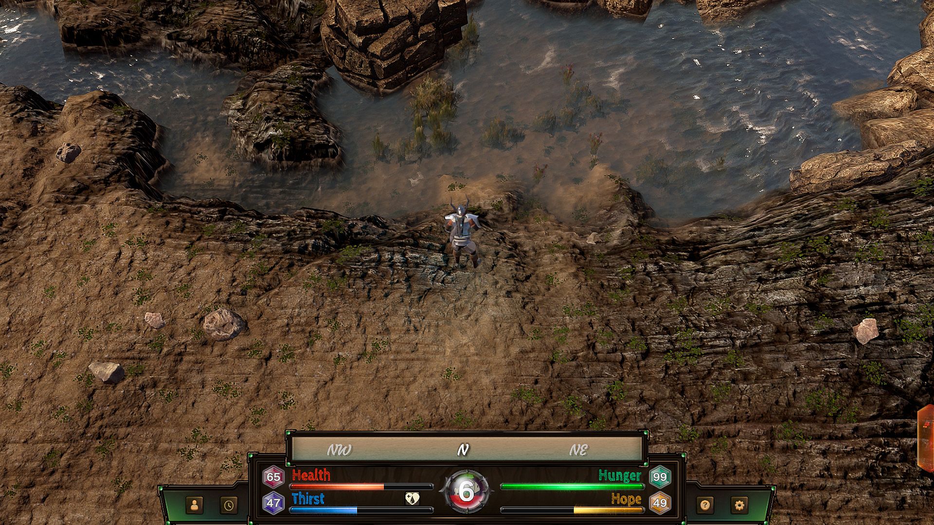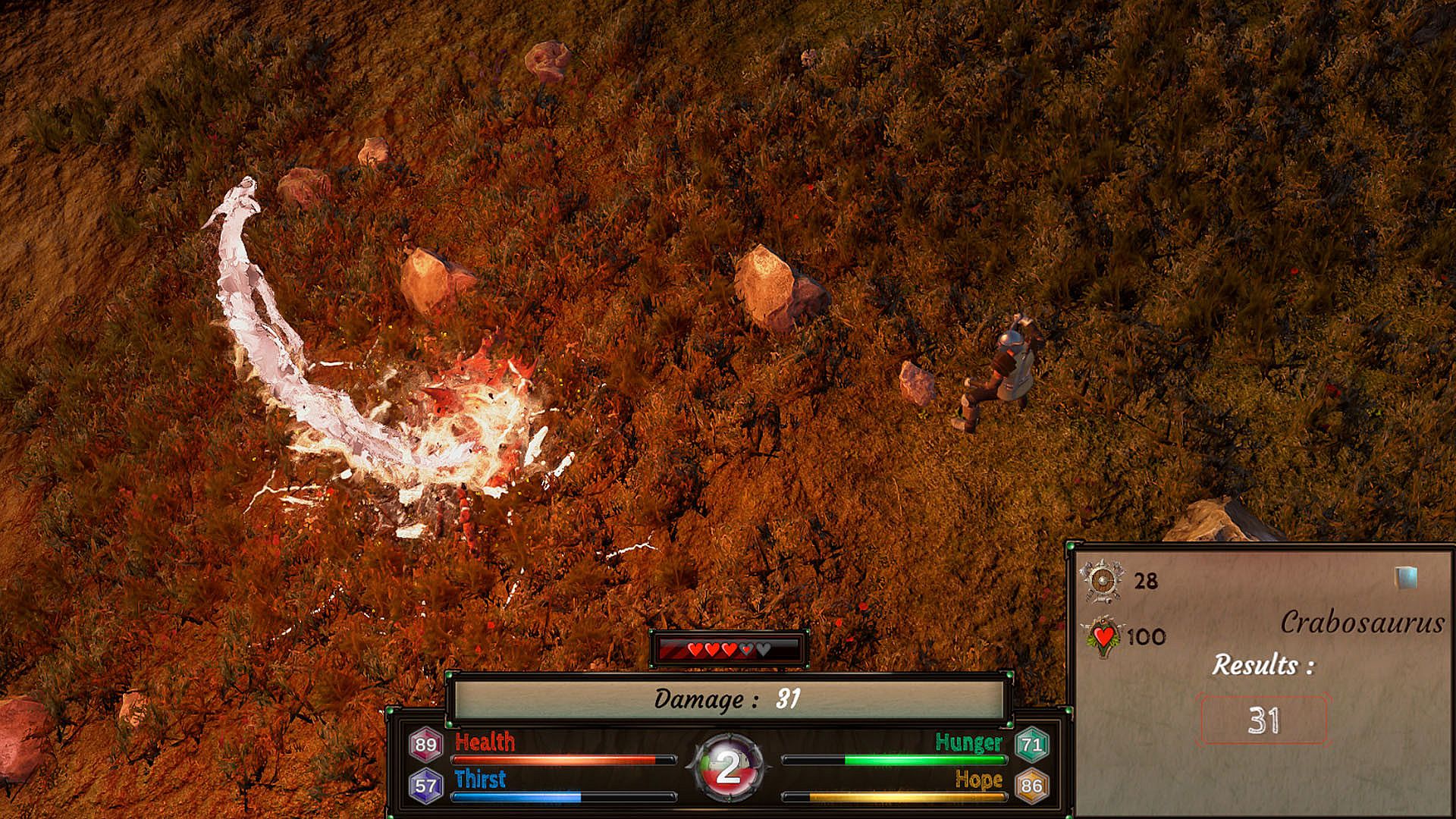 Explore the island and gather resources to meet vital needs while avoiding disease, exhaustion, or despair.