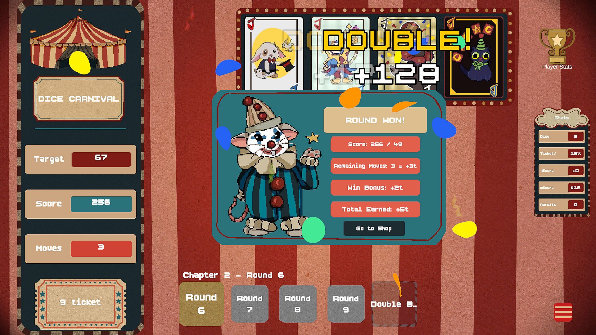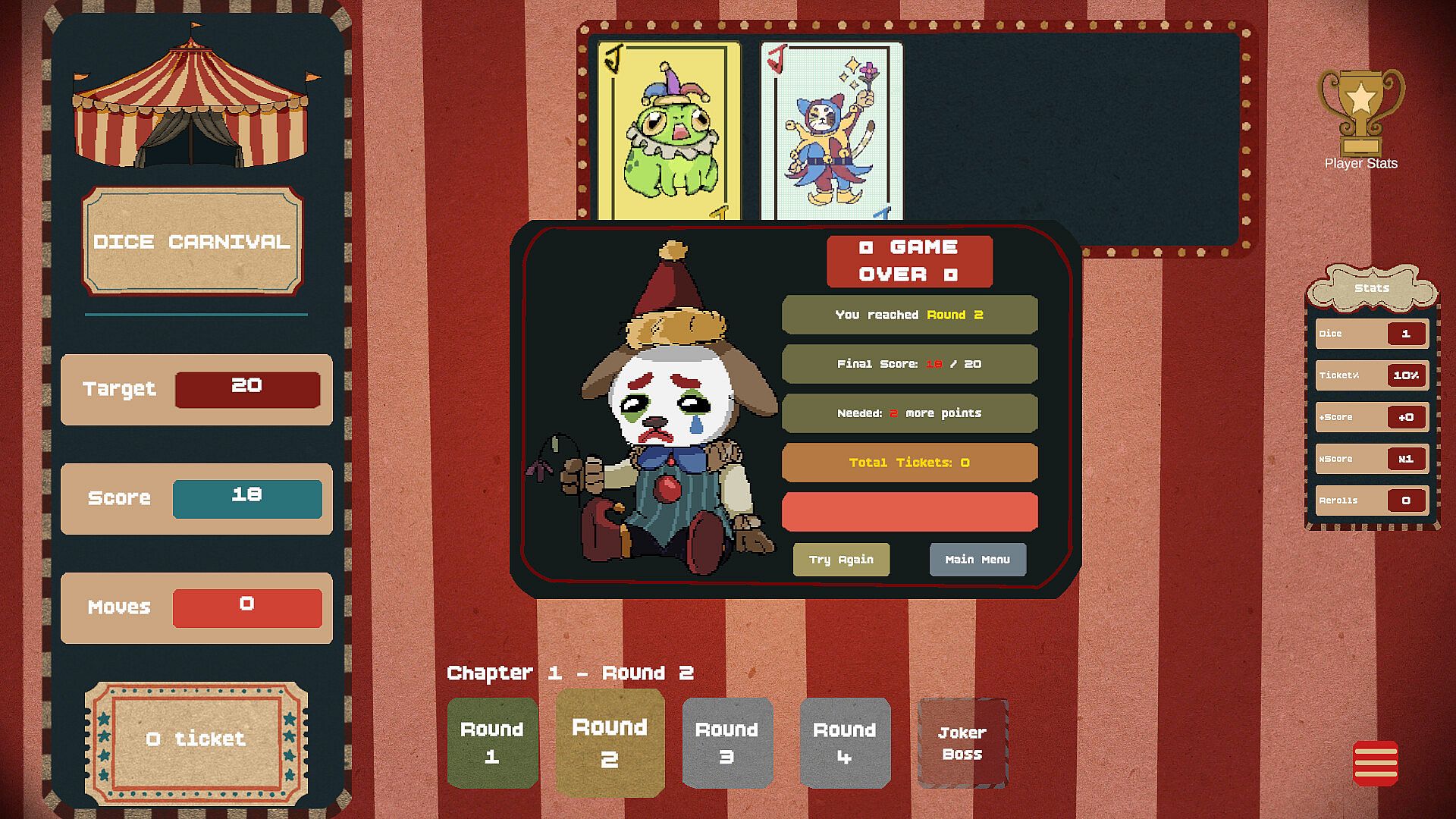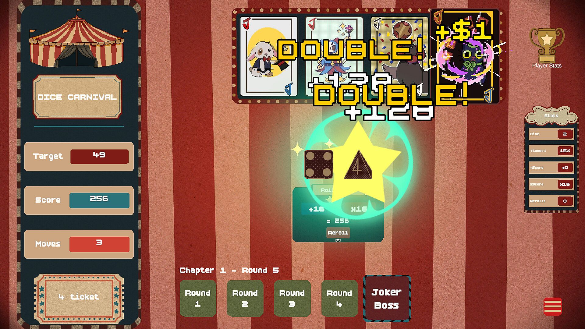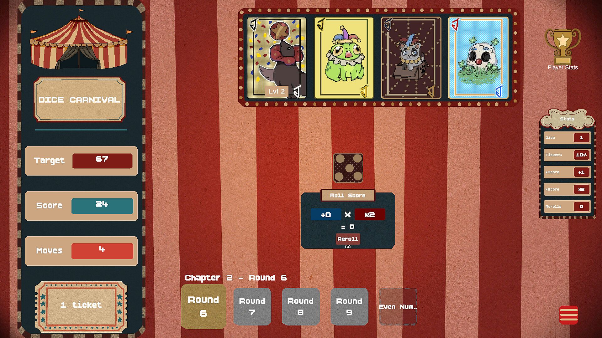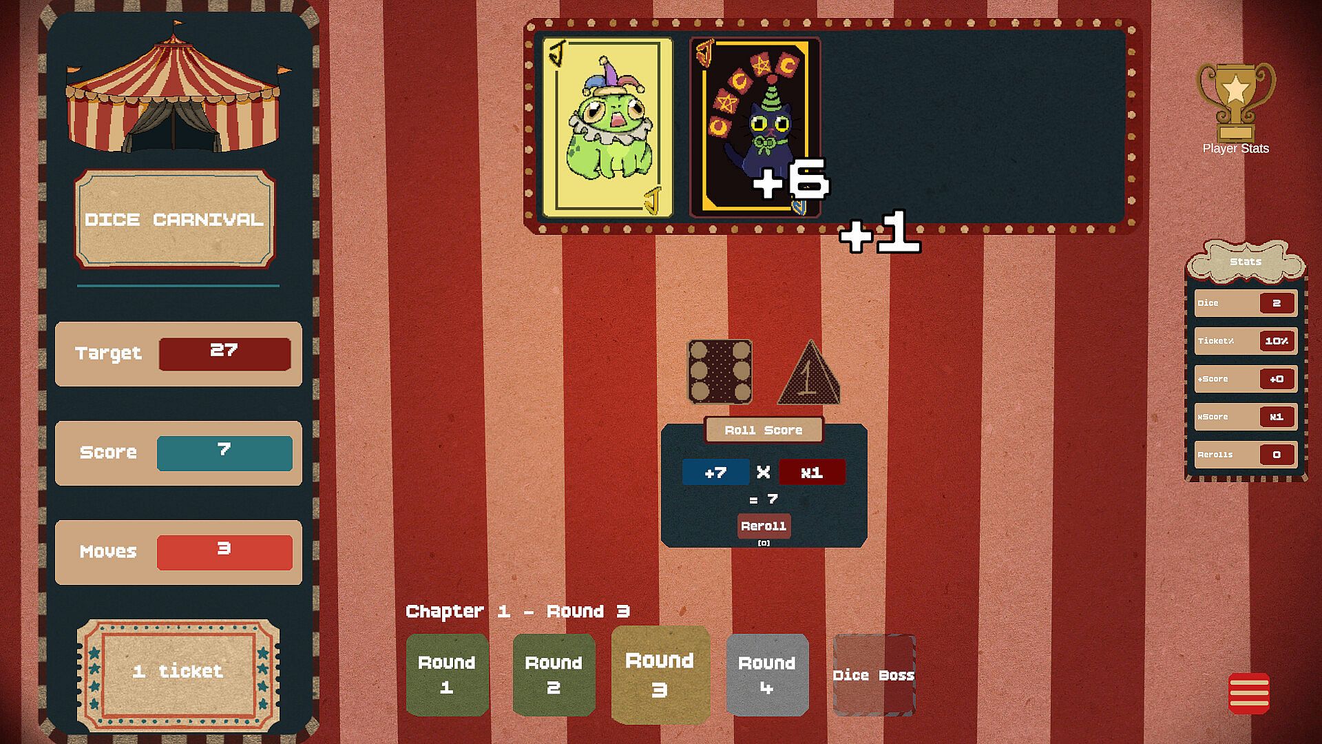 Dice Carnival is a roguelike deckbuilding game inspired by dice rolls, focused on creating powerful synergies to achieve big wins.