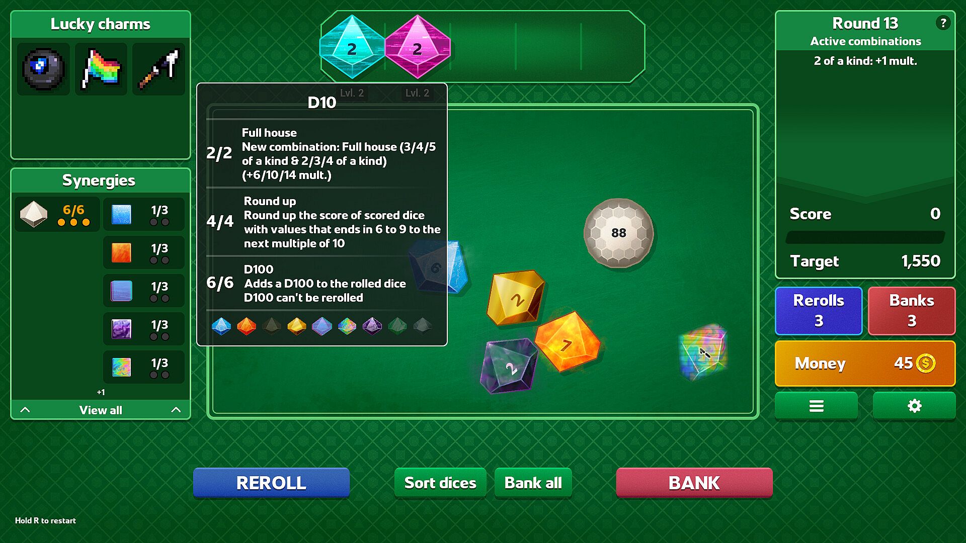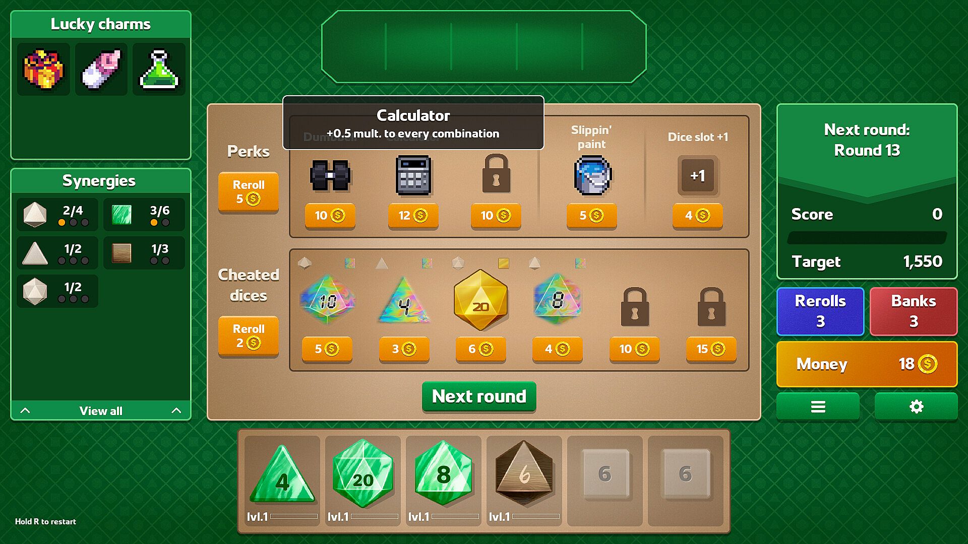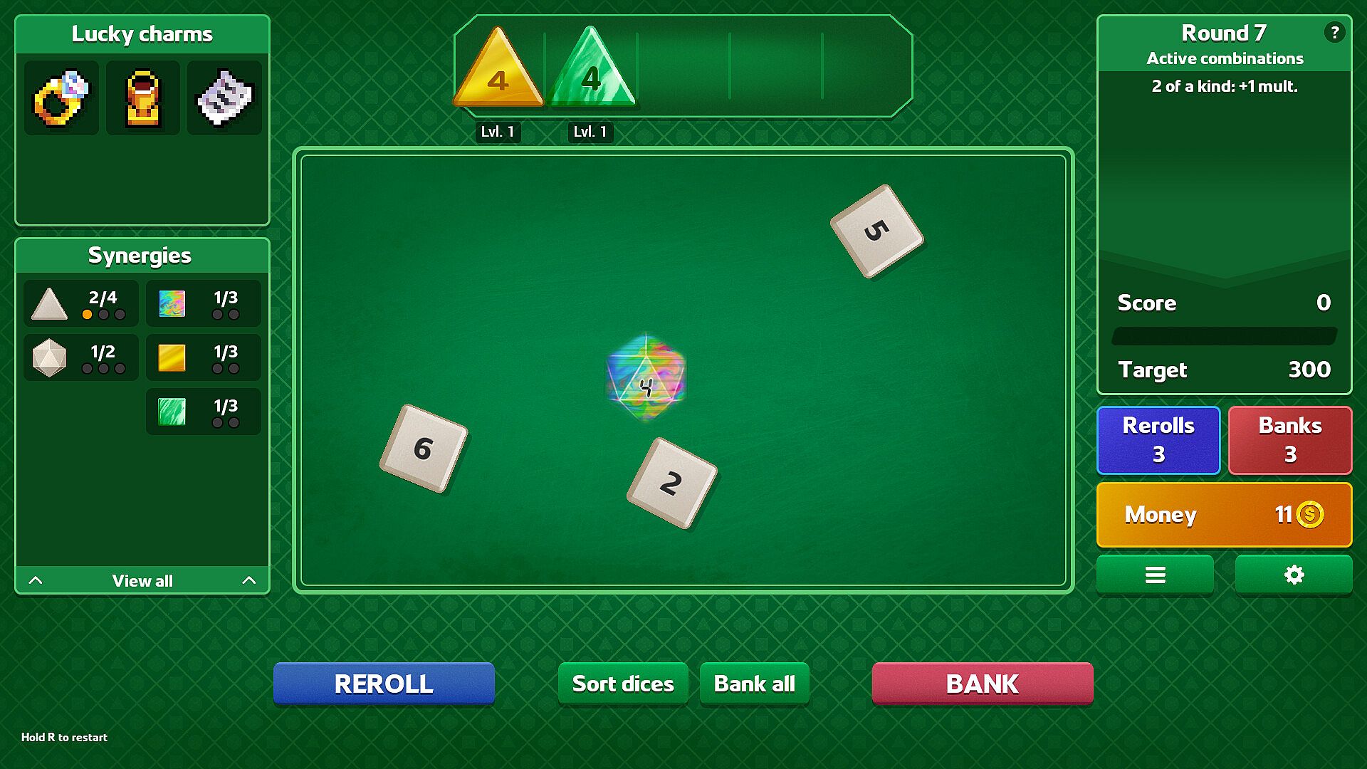 Equip lucky charms to create game-breaking combos and sneaky strategies. Possibilities are endless and each run is sure to be different thanks to over 100 different charms to unlock, combined with the effects of your dice collection.