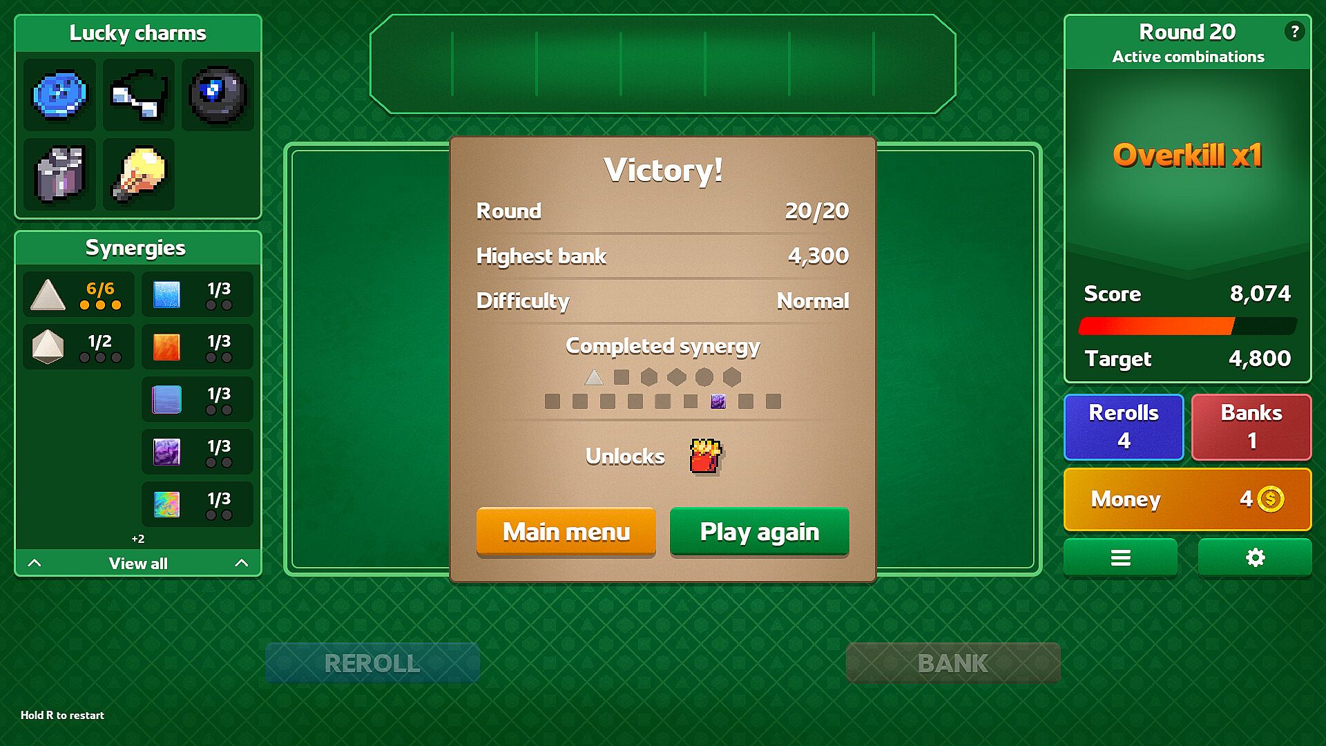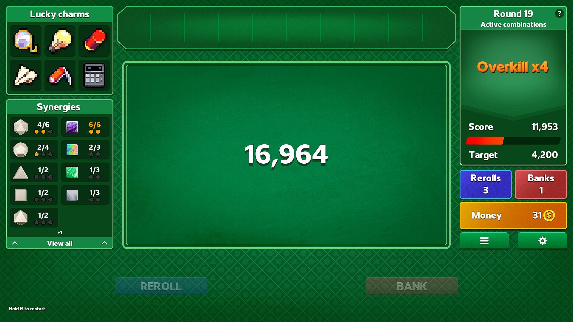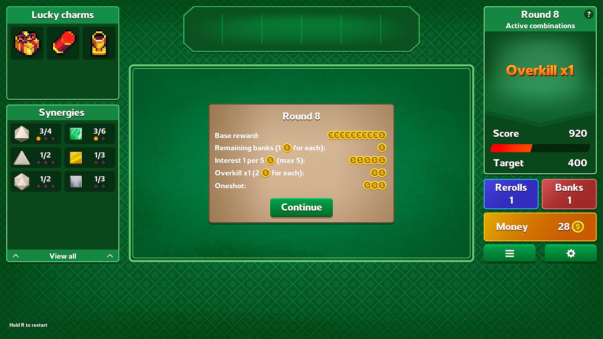 Equip lucky charms to create game-breaking combos and sneaky strategies. Possibilities are endless and each run is sure to be different thanks to over 100 different charms to unlock, combined with the effects of your dice collection.