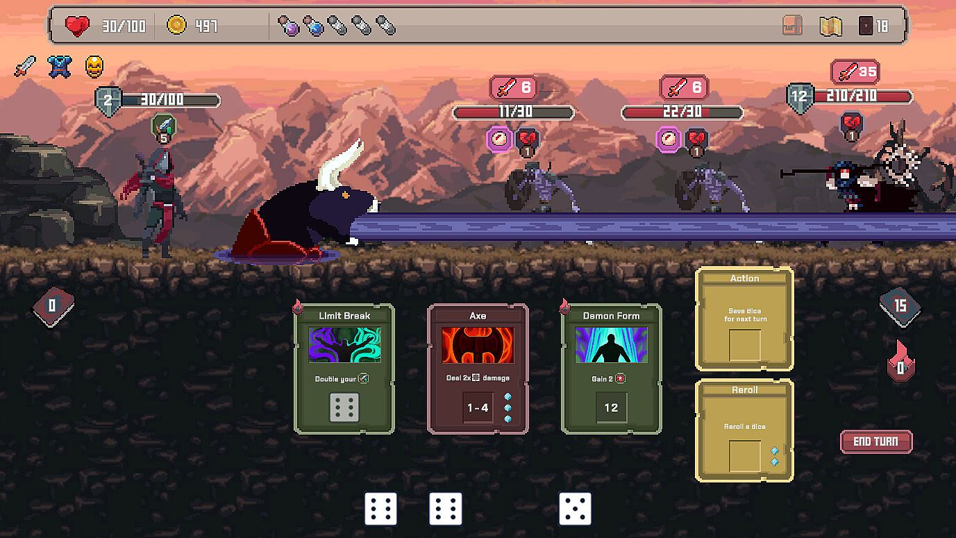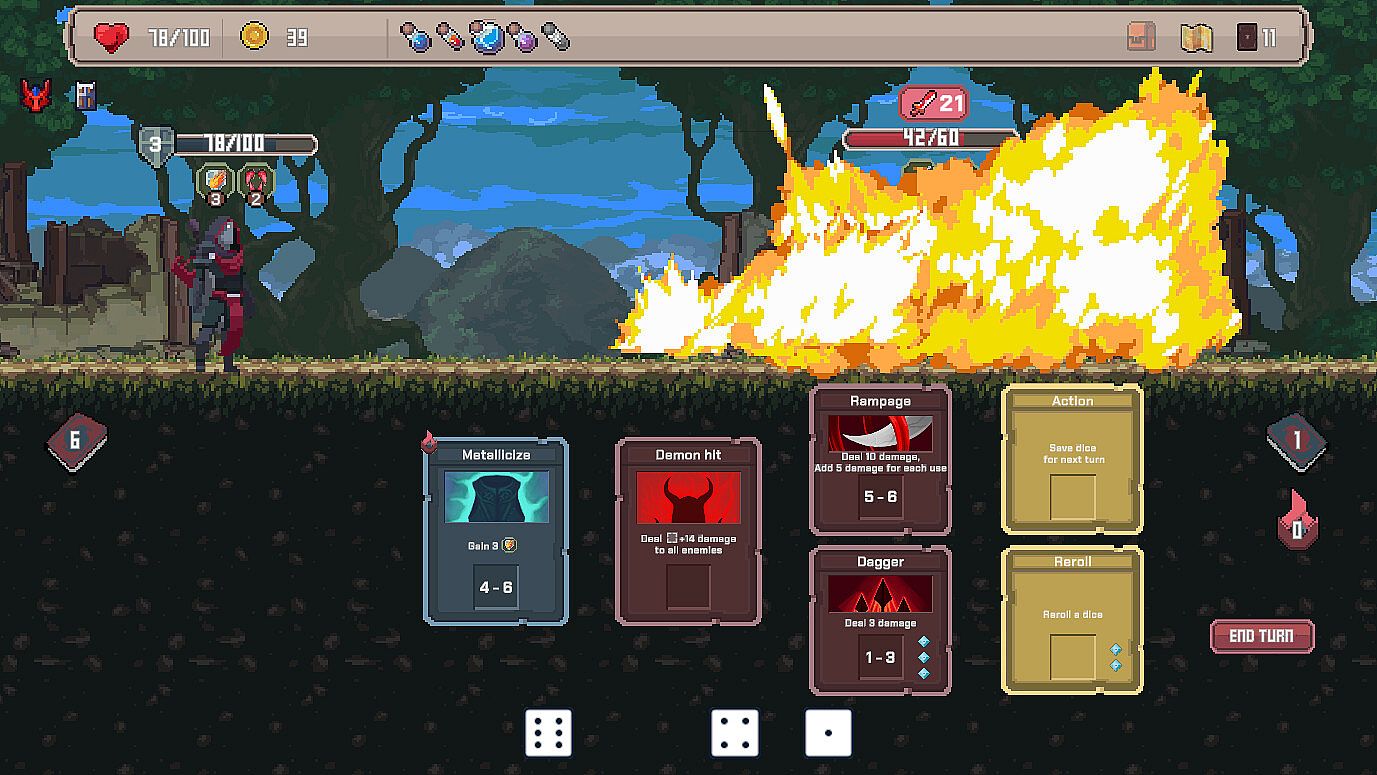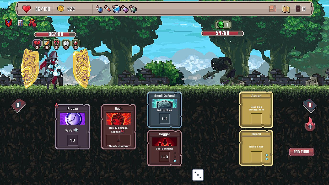 Roll a pool of dice each turn and draw cards from your deck. Next, use dice to activate cards and set up your defense, debuff the enemy, or deal as much damage as you can. The more card-dice synergies you discover, the more unstoppable — and satisfying! — your combos become.
