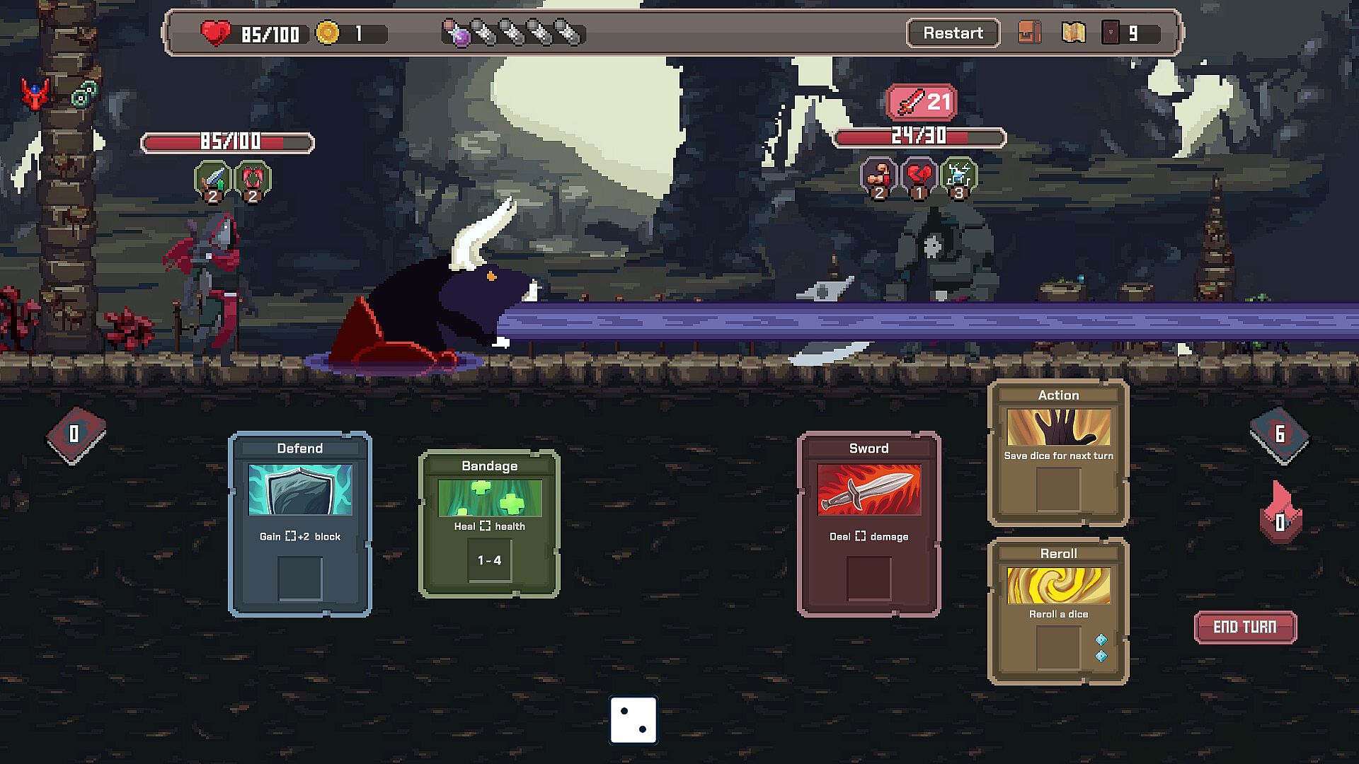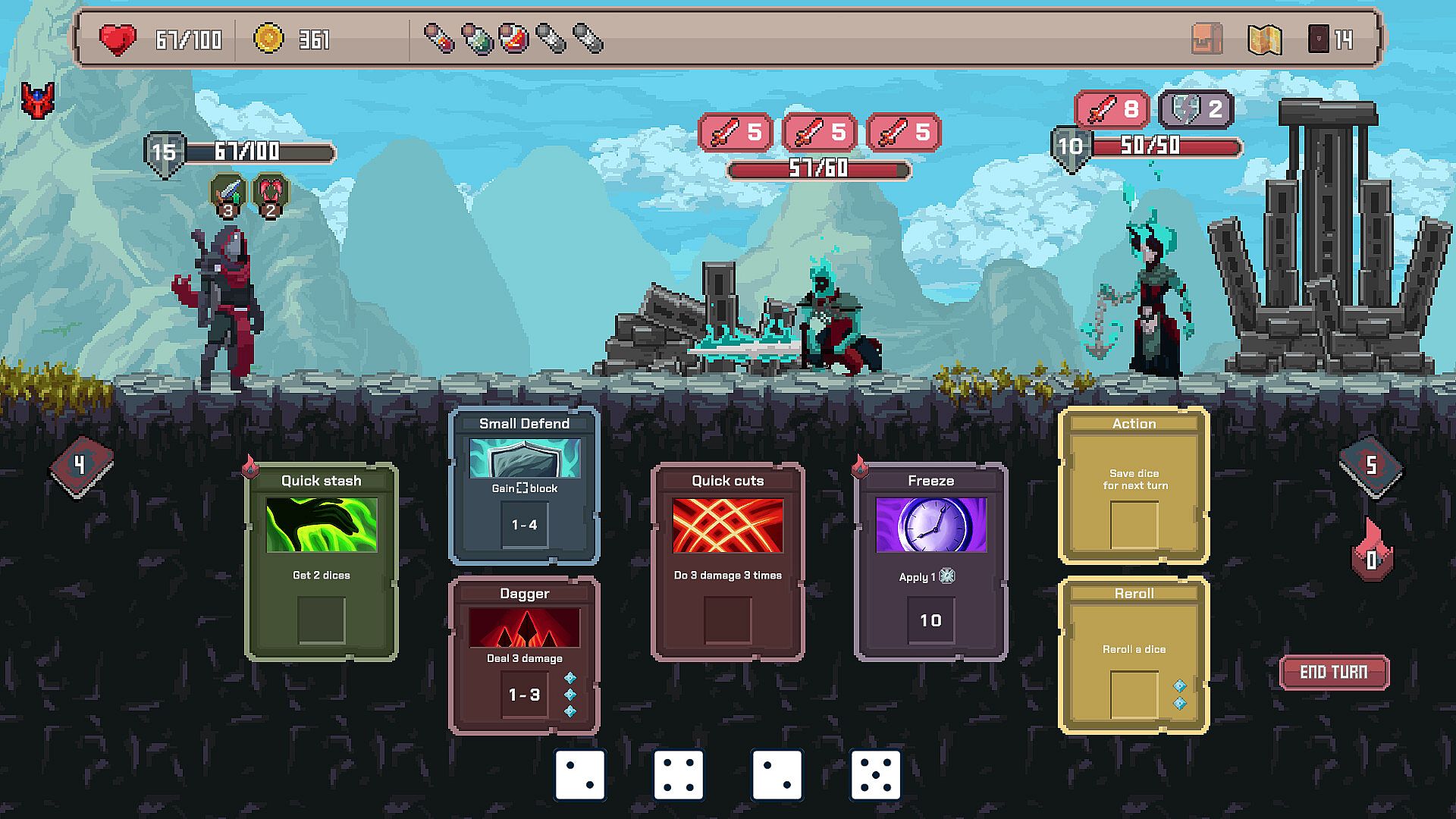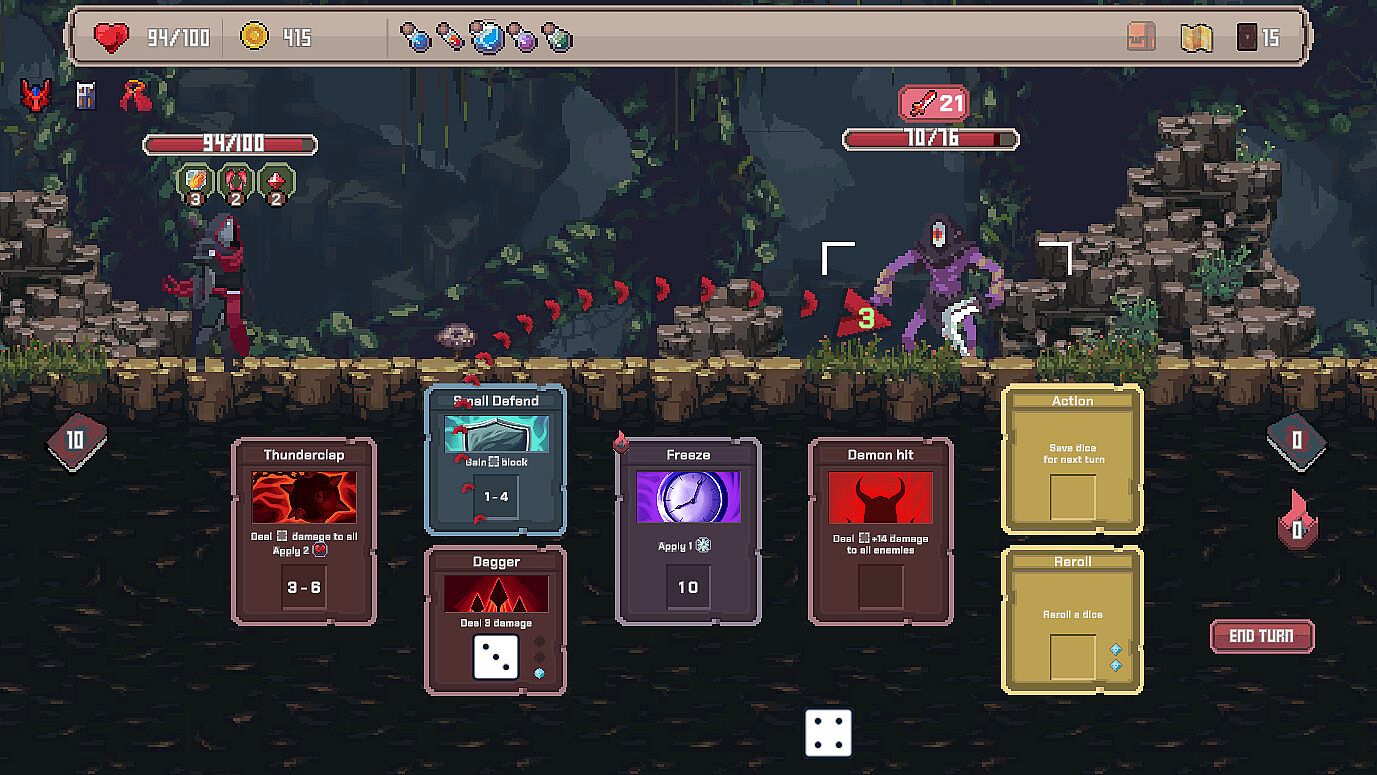 Roll a pool of dice each turn and draw cards from your deck. Next, use dice to activate cards and set up your defense, debuff the enemy, or deal as much damage as you can. The more card-dice synergies you discover, the more unstoppable — and satisfying! — your combos become.