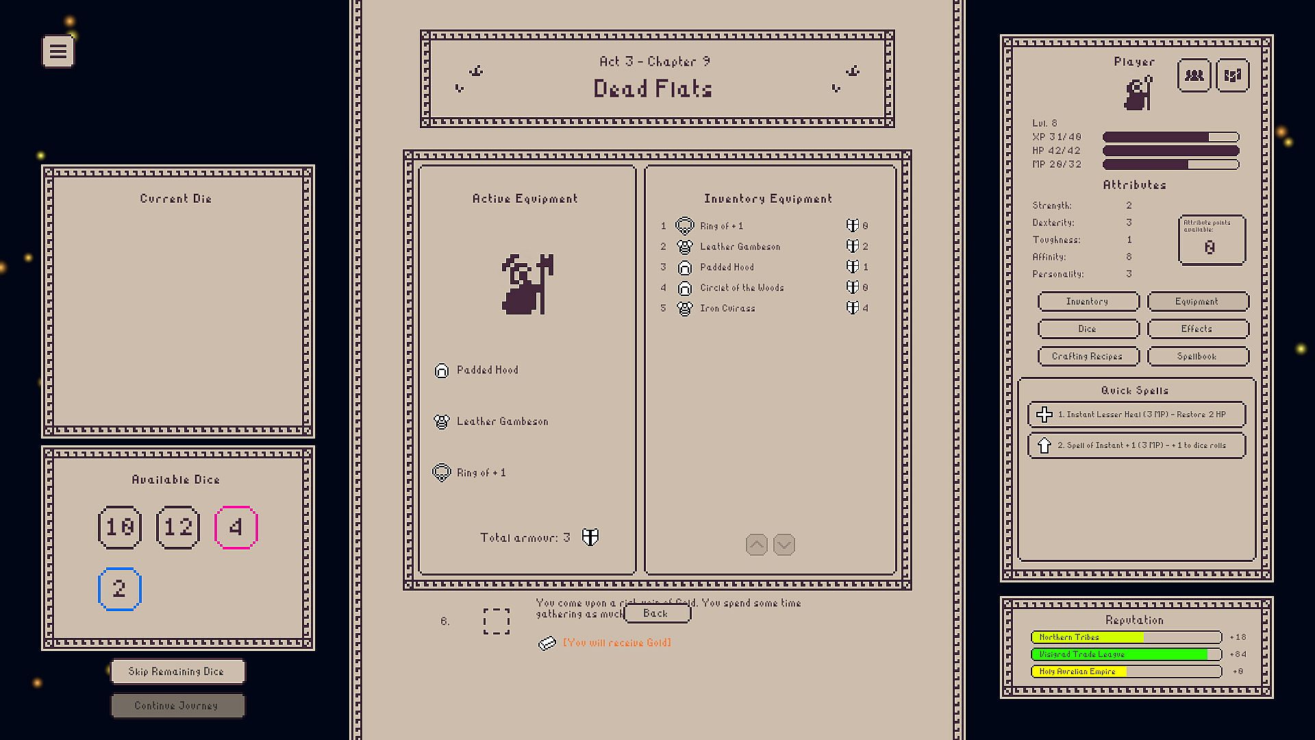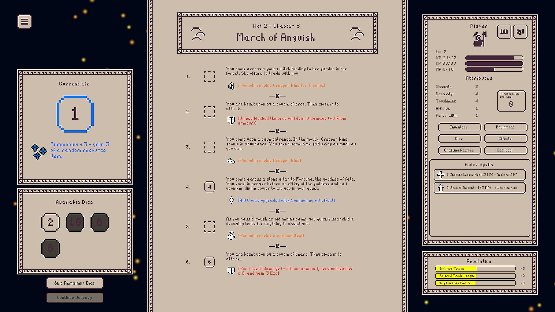 Cultists have attacked your village and destroyed your home. Set out on a quest for vengeance and use your mastery of dice, probabilities, and magic to settle the score or die trying.