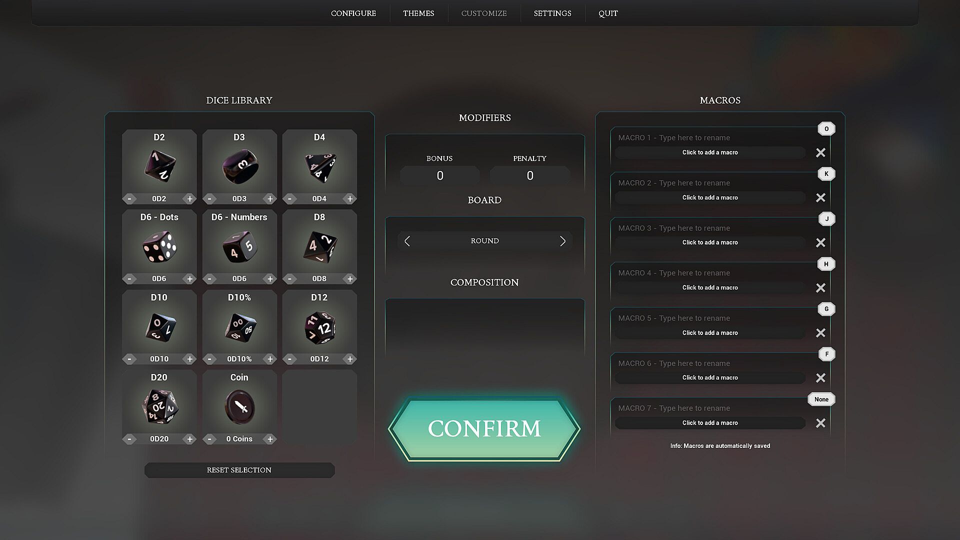 • Save your favorite dice combinations