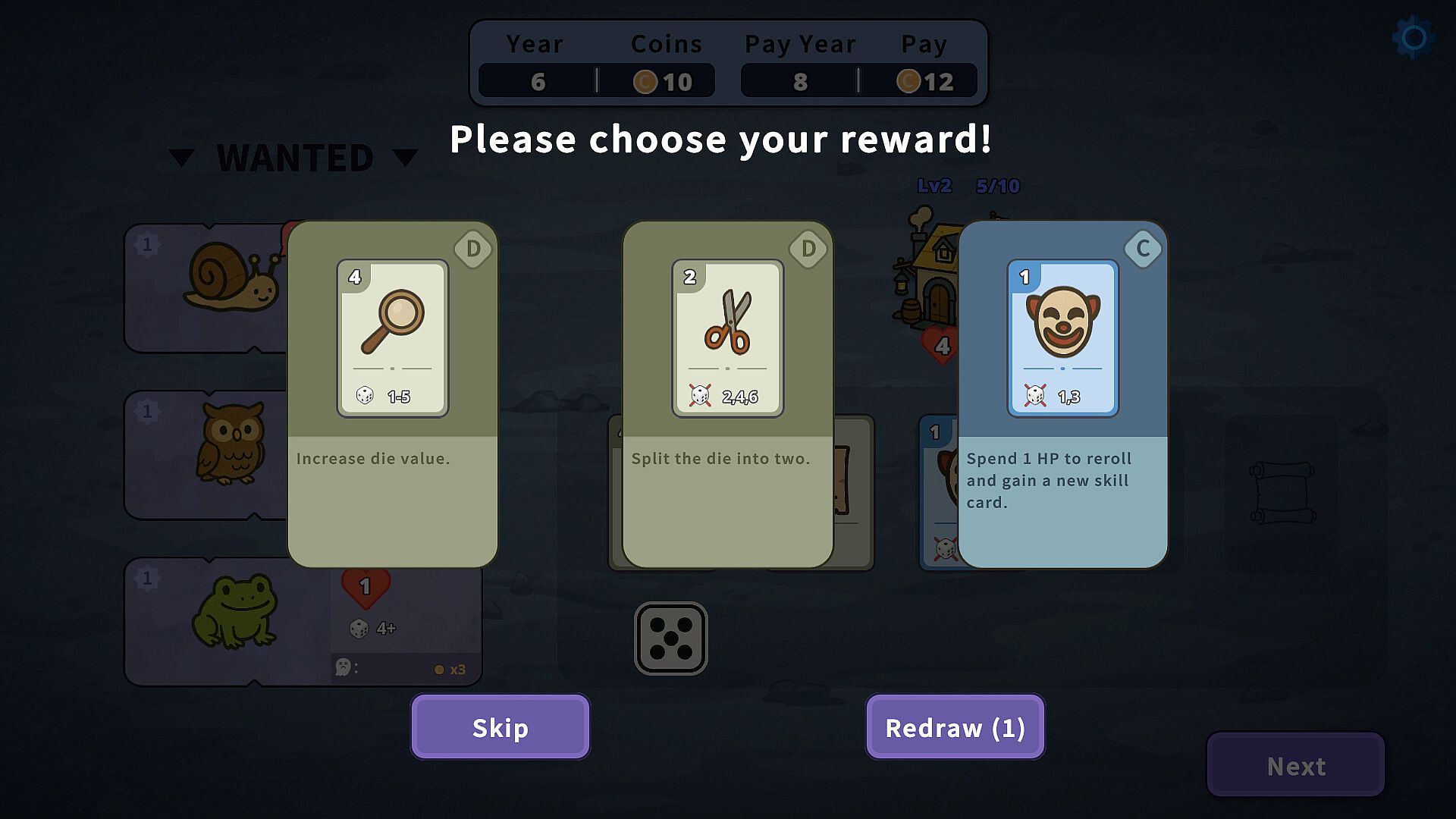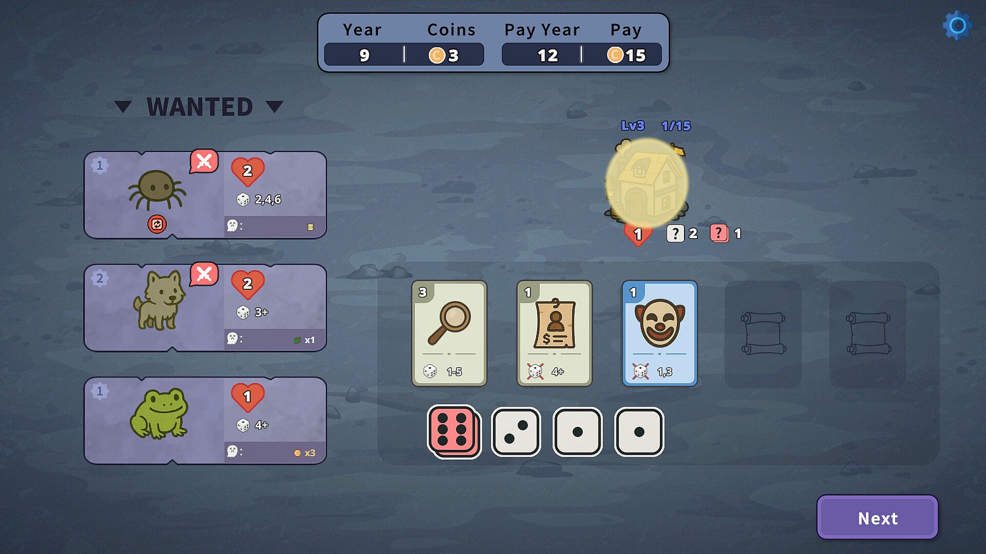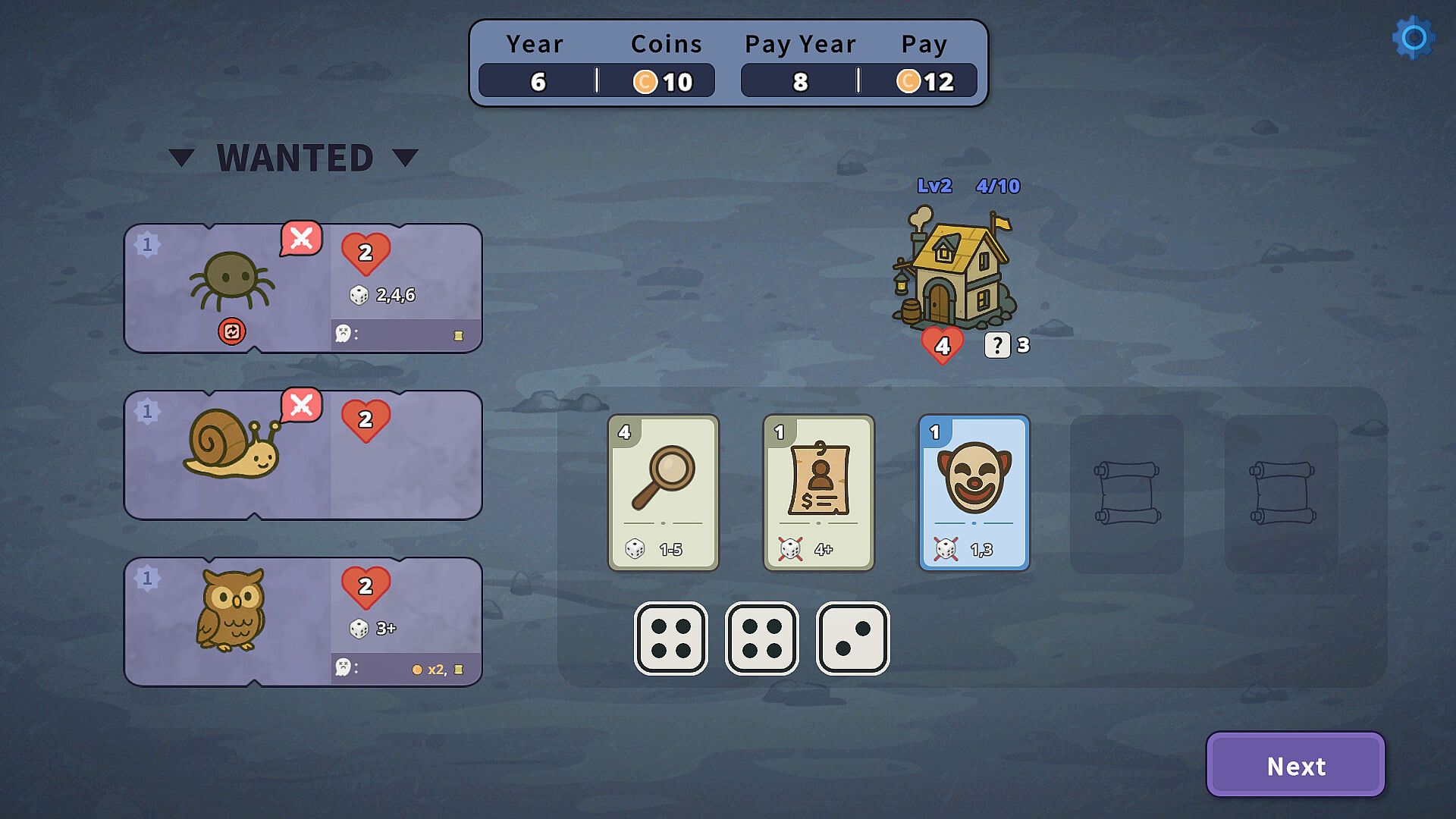 Turn-based strategy meets dice and card mechanics in a fantasy world of spirits and magic. Players take on the role of a bounty hunter aiming to pay off a mortgage by rolling dice, playing skill cards, defeating monsters, and collecting rewards. Three unique cottages deliver distinct skills and playstyles, while five ascension levels ramp up the challenges. Endless Mode tests survival without a win condition, and a card compendium tracks your growing collection. Flexible resource management shines through dice-card synergies and adaptation to quirky enemies and random rolls. No time pressure lets you plan freely, making this indie gem perfect for casual players and strategy fans who savor judgment over luck.