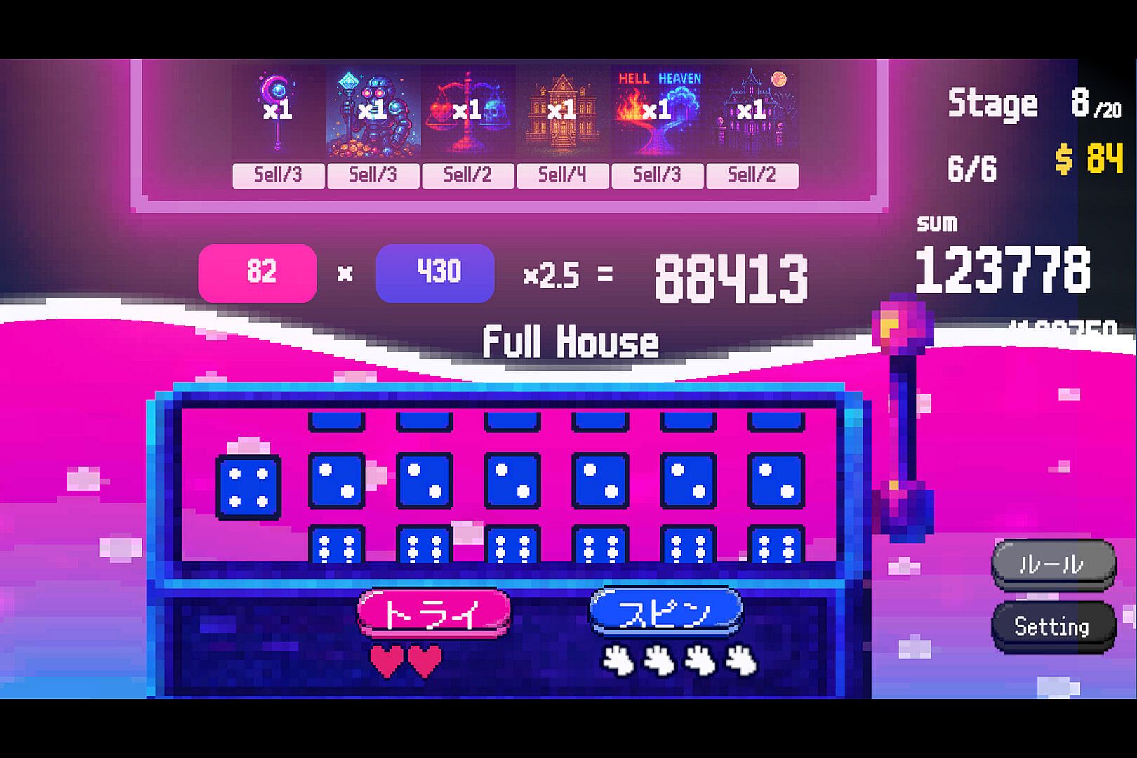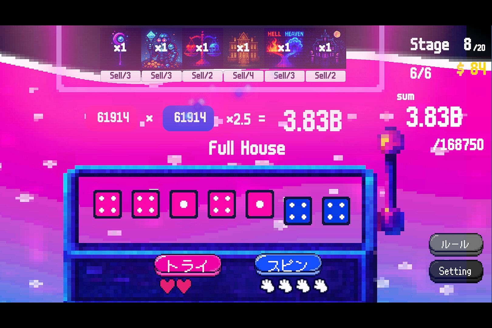 Players must land as many hands as possible within a limited number of rolls each stage, stacking up points to beat the target score. Spend your hard-earned coins on powerful items to turbocharge your progress and break every limit.