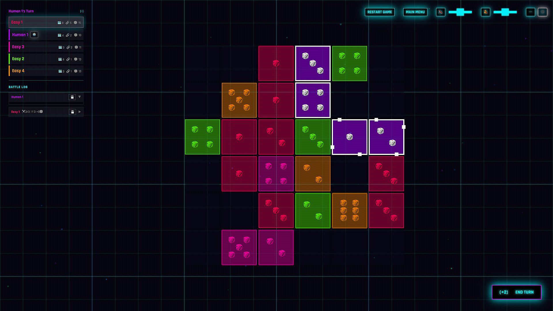 Attack: Select your territory and an adjacent enemy tile. Your dice stack rolls against theirs.