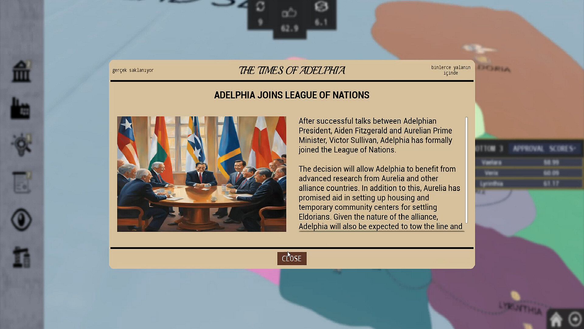 Take charge as the President of a newly-independent country, Adelphia. As Aiden Fitzgerald, you will take on this daunting role and lead Adelphia forward through tumultuous times by prioritizing the right action at each step. Build infrastructure, approve policies, handle unforeseen events, keep your ministers happy by fulfilling their demands and much more.