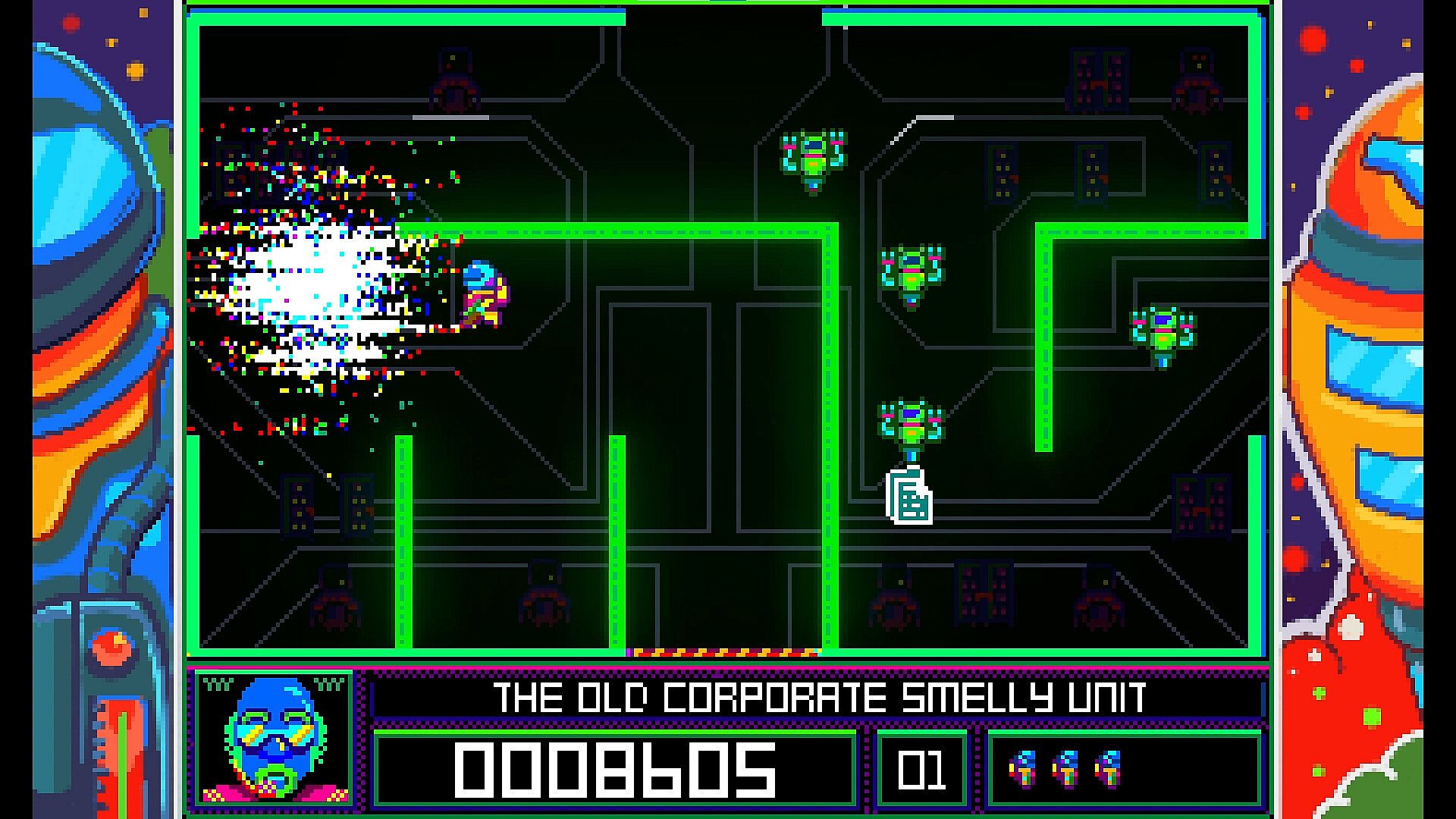 As you venture through the maze, finding and destroying security servers, you are accompanied by your friend The Union Rep over the video communicator. The Union Rep will provide useful instructions for getting out of the maze.