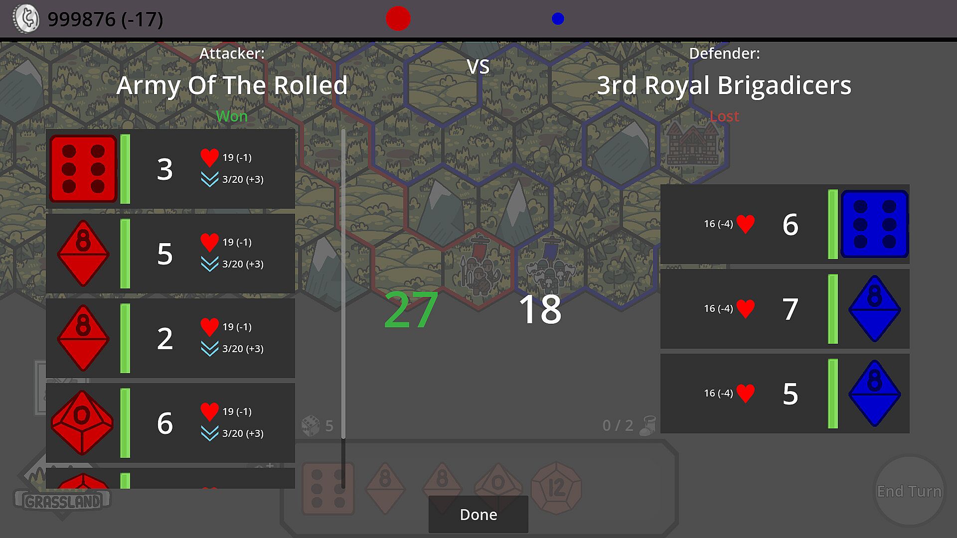Your dice are your armies. Experienced dice roll higher, low health dice roll lower.